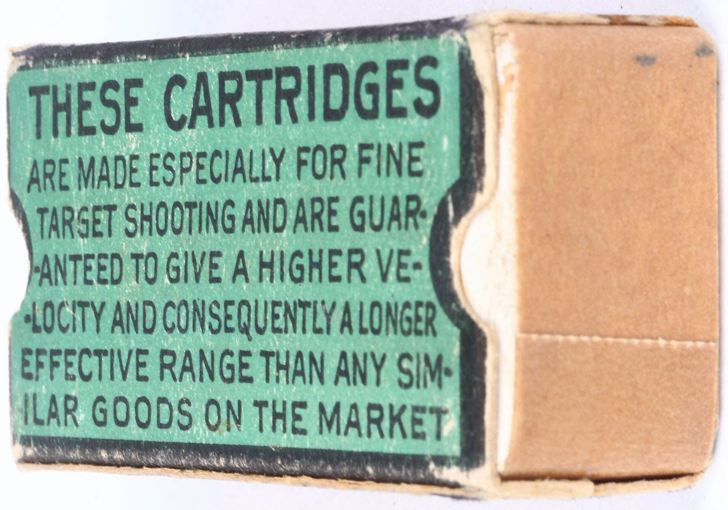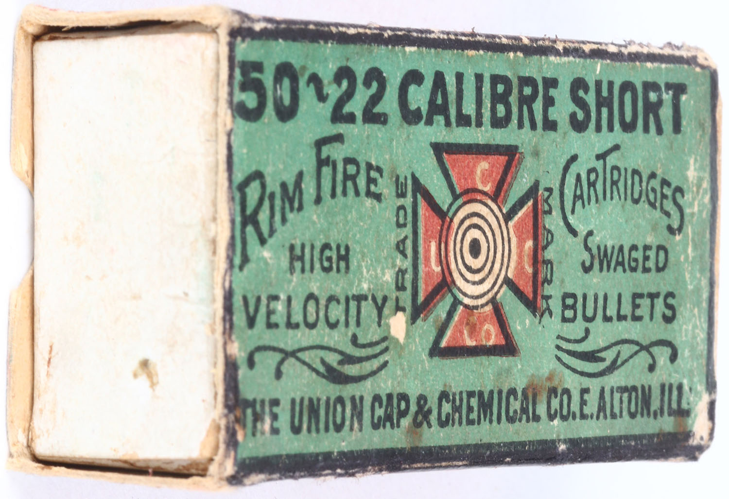 Union Cap & Chemical Co., 5022 Calibre Short, .22 Short, High Velocity Swaged Bullets, RHWeb: UCC-1 S-3.5, Partial 22rds., correct ammo with Maltese cross H/S, 1pc. Green red & black box, box is missing both end flaps, right end of inside tray has been taped, box has very good color with some age soiling & very minor shelf wear, some corner wear, very minor edge wear, ammo is good. Grade: Very Good - Value: 50 to 500