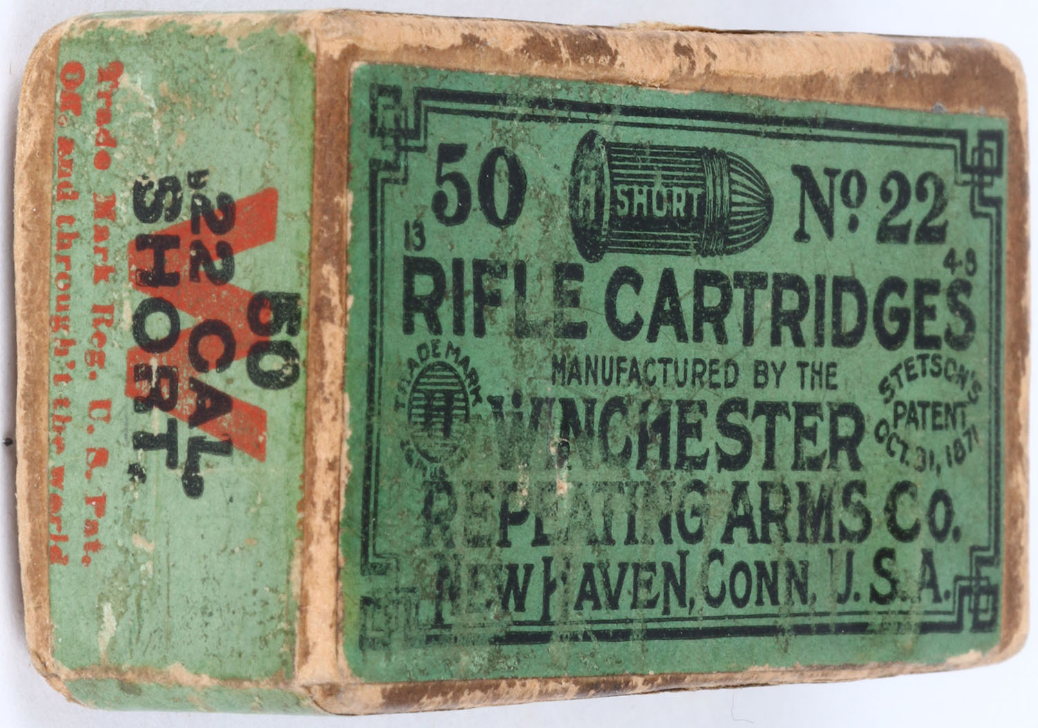 Winchester, Rifle Cartridges, .22 Short, RR: WRA-42 S-17, Partial 31rds., 2pc. Buff box with green top & side sealing labels, box is solid with very good color, some age soiling & shelf wear, minor edge & corner wear, labels are intact, ammo is very good. Grade: Very Good + - Value: 30 to 120