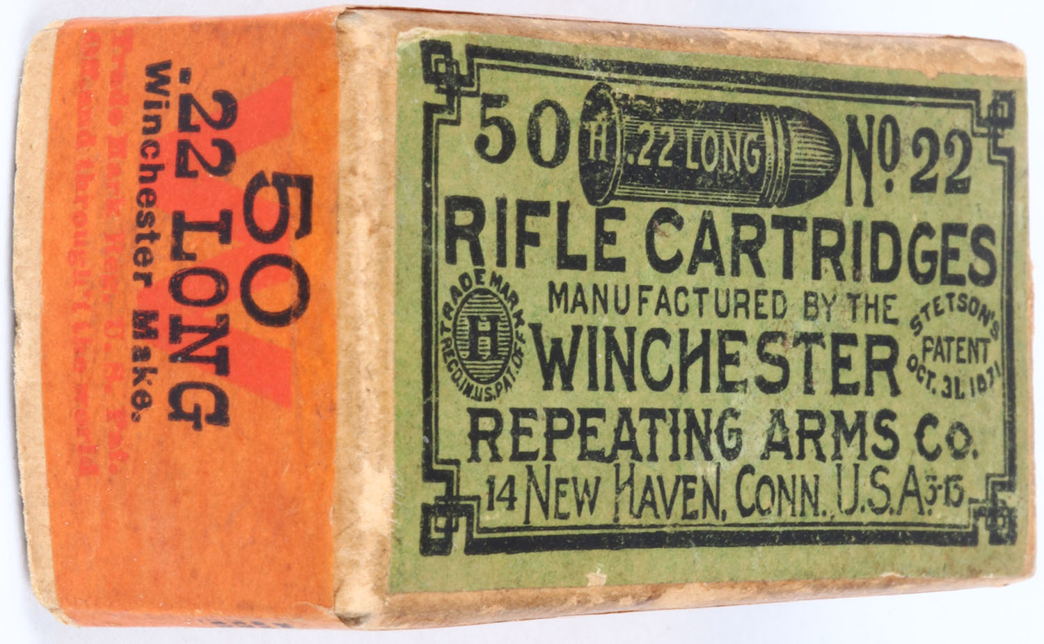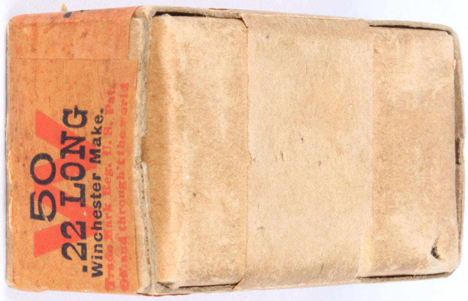 Winchester, Rifle Cartridges, .22 Long, RR: WRA-47 L-12c, Full, 2pc. Buff box with green top & orange side sealing labels, box is solid with very good to excellent color with minor age soiling, very minor edge wear, corners are mostly sharp, labels are intact, ammo is good to very good. Grade: Excellent - Value: 50 to 150