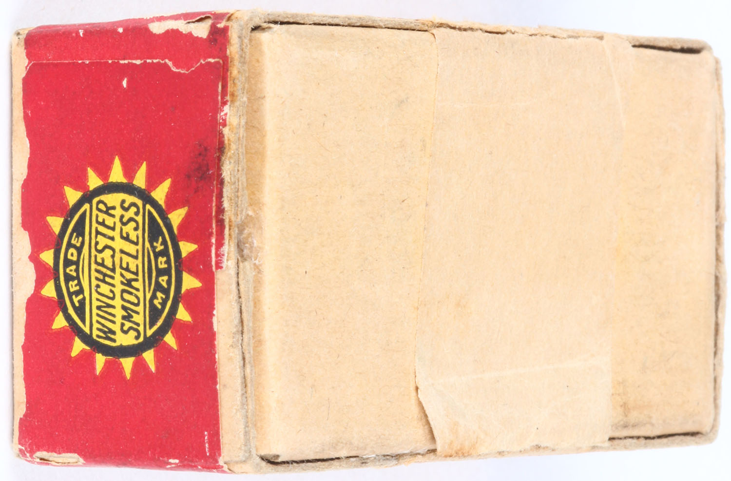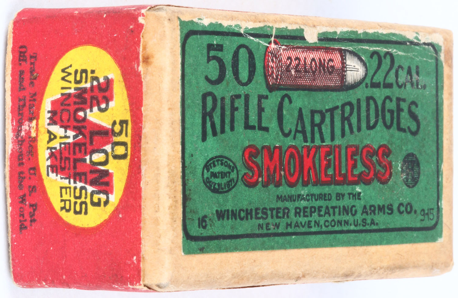 Winchester, Smokeless Rifle Cartridges, .22 Long, RR: WRA-65 L-24d, Full, 2pc. Buff box with green top and red & yellow side sealing labels, box is solid with excellent to minty color, only very minor age soiling & shelf wear, corners are mostly sharp, edges are mostly crisp, labels are intact, ammo is excellent. Grade: Excellent + - Value: 30 to 90
