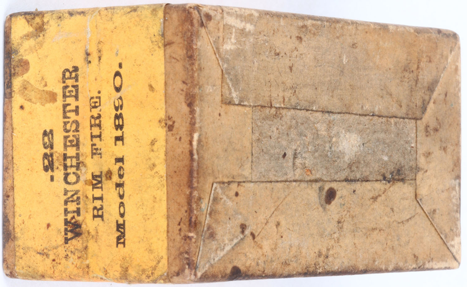 Winchester, .22 Winchester Rim Fire, RR: WRA-149 WRF-3a, FULL & SEALED, 2pc. Buff box with green top & orange side sealing labels, box is solid with very good color, age soiling, staining, partial seam split on top left edge, edges are otherwise crisp, very minor corner wear, labels are intact. Grade: Very Good ++ - Value: 100 to 300