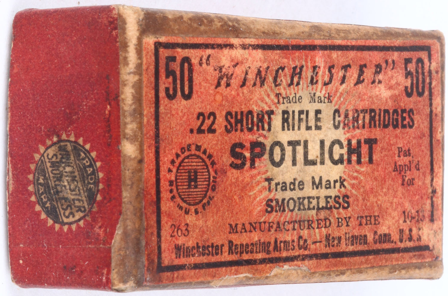 Winchester, Spotlight, .22 Short, Smokeless, RR: WRA-77 S-2a, Partial 43rds., 2pc. Buff box with red top & side sealing labels, box is solid with good to very good color, age soiling, some color fading to top, very minor shelf wear, minor edge & corner wear, labels are intact, ammo is good. Grade: Very Good + - Value: 40 to 120