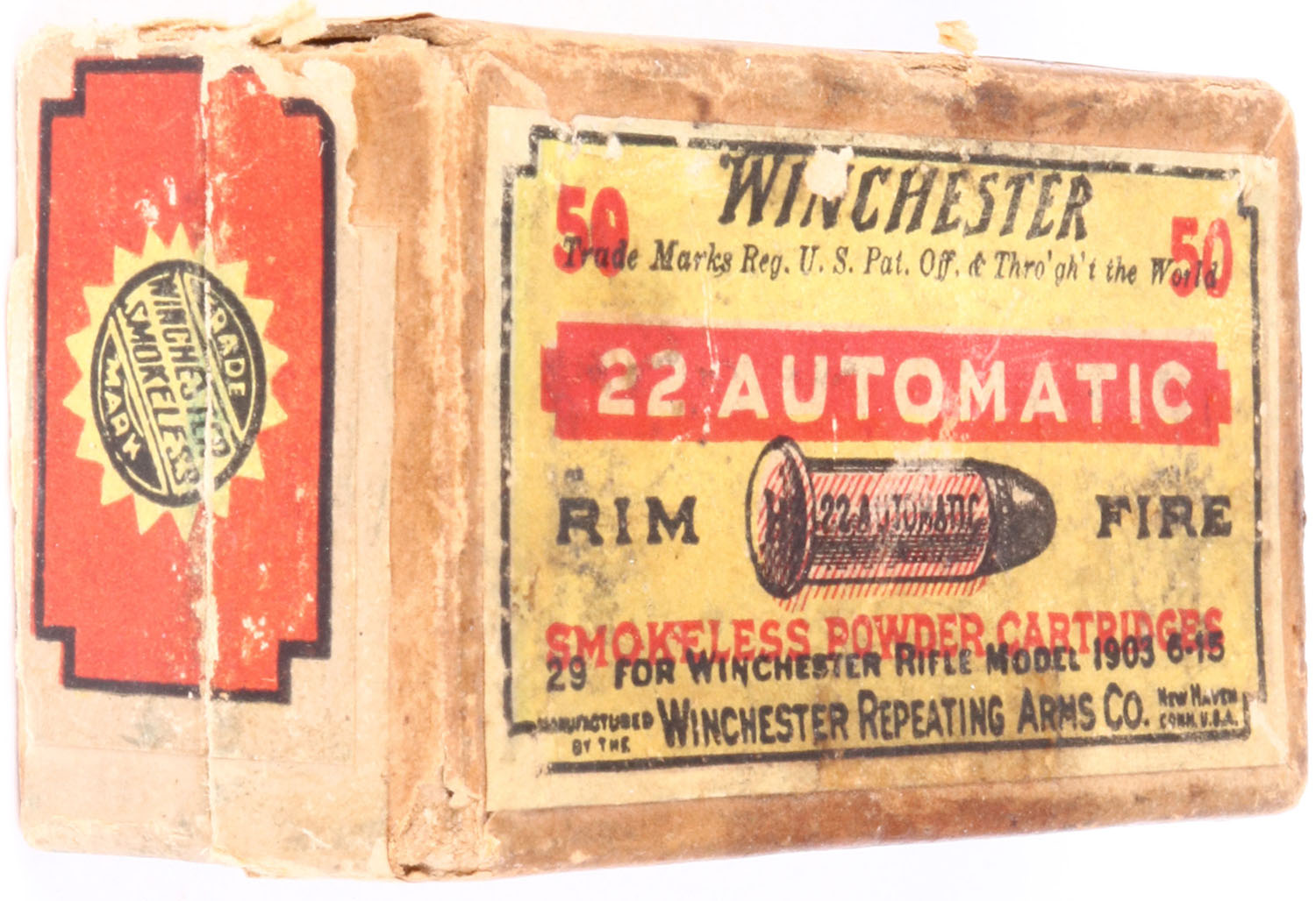 Winchester, .22 Automatic Rim Fire Smokeless Powder Cartridges, RR: WRA-169 WA-6b, Full, 2pc. Buff box with yellow and red top & side sealing labels, box is solid with very good color, age soiling, stain on top & front side, very minor shelf wear, partial vertical seam splits to left end of lid, some corner wear, very minor edge wear, labels are intact, ammo is excellent. Grade: Very Good ++ - Value: 50 to 150