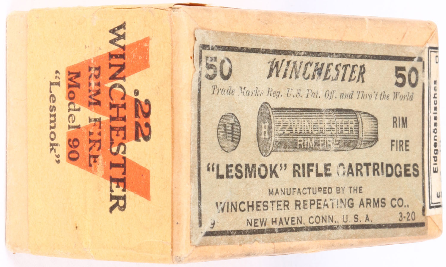 Winchester, ''Lesmok'' Rifle Cartridges, .22 Winchester Rim Fire, RR: WRA-159 WRF-32b, FULL & SEALED, 2pc. Buff box with green top & yellow side sealing label, also has Swiss Army Munitions Depot label on right end, box is solid with very good to excellent color, very minor shelf wear & color fading, corners are mostly sharp, edges are crisp, labels are intact. Grade: Excellent ++ - Value: 100 to 300