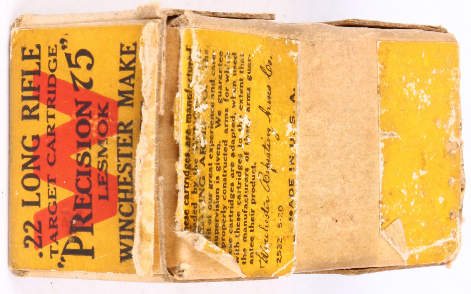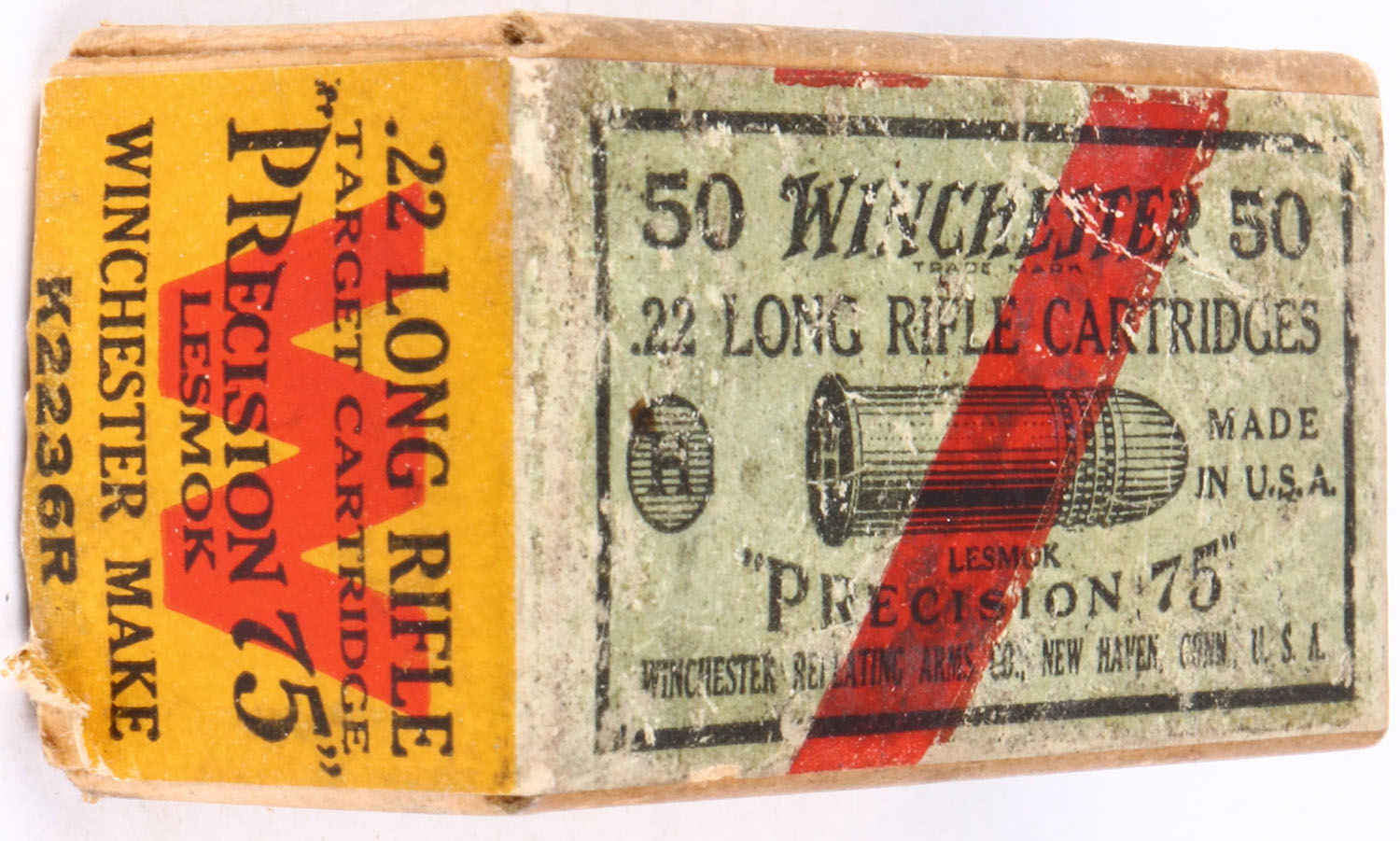 Winchester, ''Precision 75'', .22 Long Rifle, RR: WRA-129 LR-42, Partial 49rds., 2pc. Buff box with green & yellow wraparound label, box is solid with very good color, very minor age soiling, some shelf wear, corners are mostly sharp, edges are crisp, labels are intact, ammo is excellent. Grade: Excellent - Value: 30 to 90