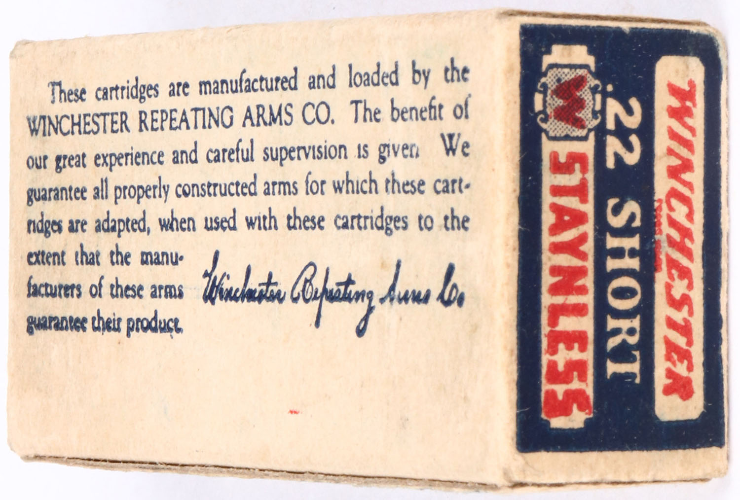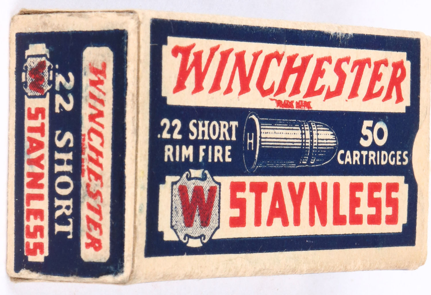 Winchester, Staynless, .22 Short, RHWeb:WRA-12A S-1, Full, 1pc. Blue white & red box, box is solid with excellent color, only very minor age soiling & corner wear, edges are crisp, end flaps are very solid, ammo is good to very good. Grade: Excellent ++ - Value: 80 to 240