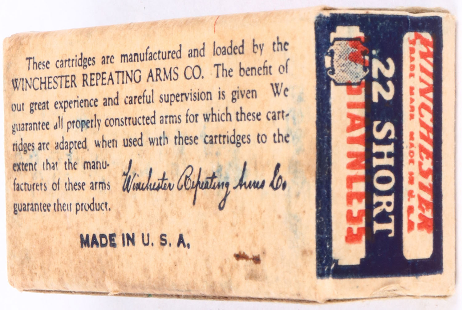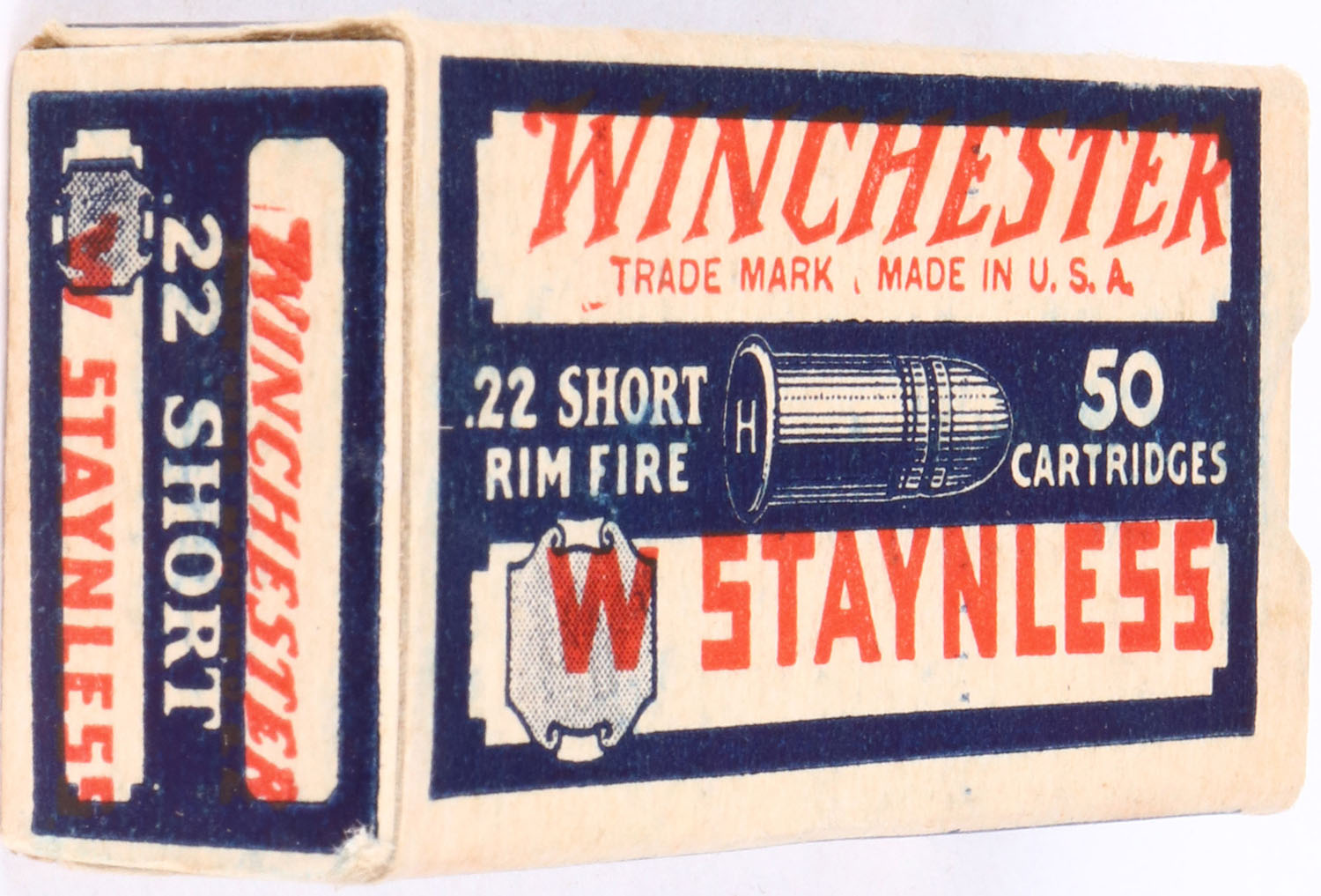 Winchester, Staynless, .22 Short, RHWeb: WRA-12B S-1b, Full, 1pc. Blue white & red box, box is solid with excellent color, only very minor age soiling & corner wear, edges are crisp, end flaps are solid, ammo is excellent. Grade: Excellent ++ - Value: 50 to 150