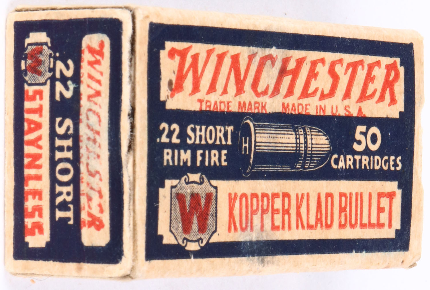 Winchester, Kopper Klad Bullet, .22 Short, RHWeb: WRA-12.5 S-1b, Full, 2pc. Blue white & red box, box is solid with excellent color, minor age soiling & shelf wear, near complete seam split to left end flap at the insert tab, corner wear, minor edge wear, right end flap is solid, ammo is excellent. Grade: Very Good ++ - Value: 10 to 50
