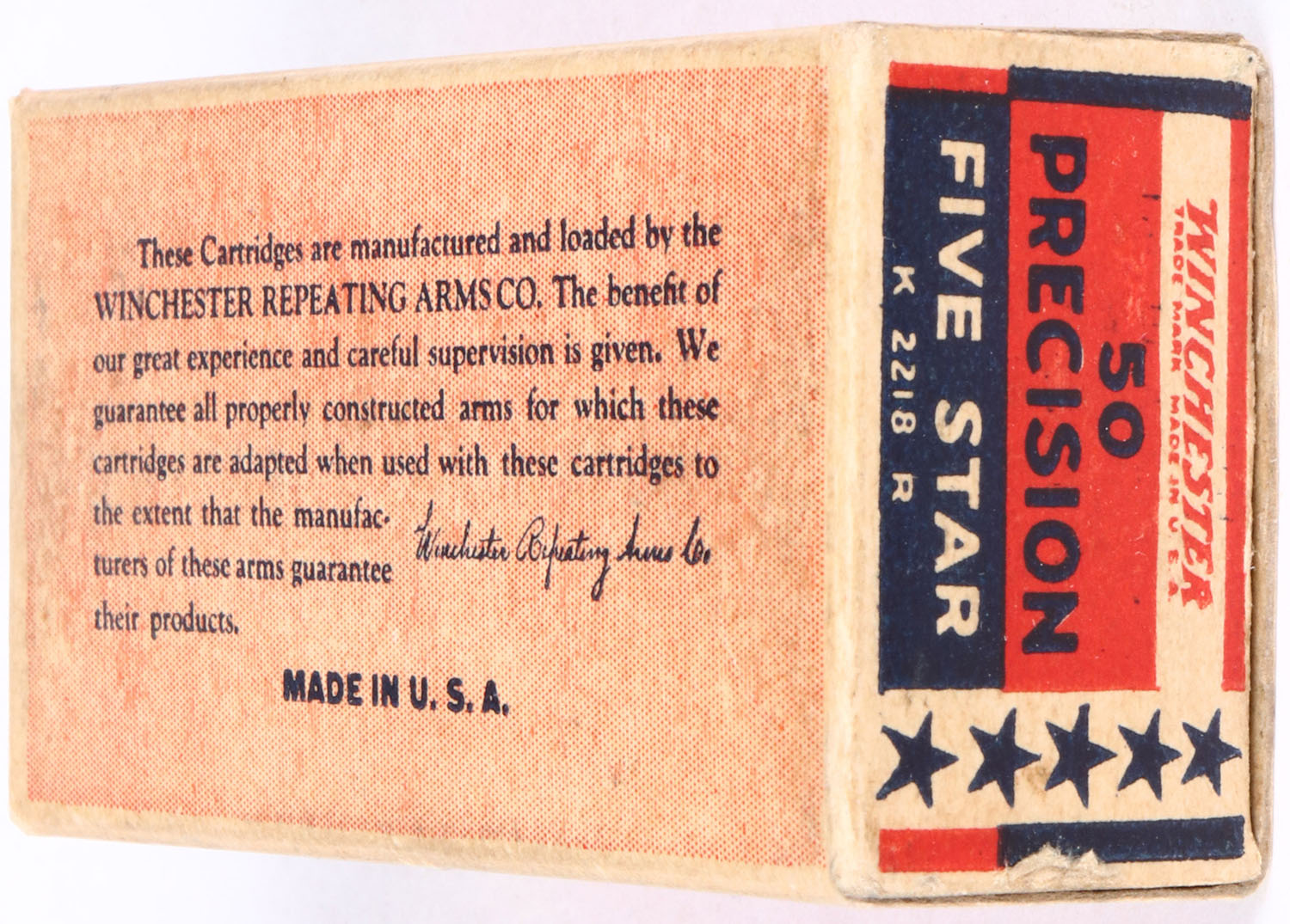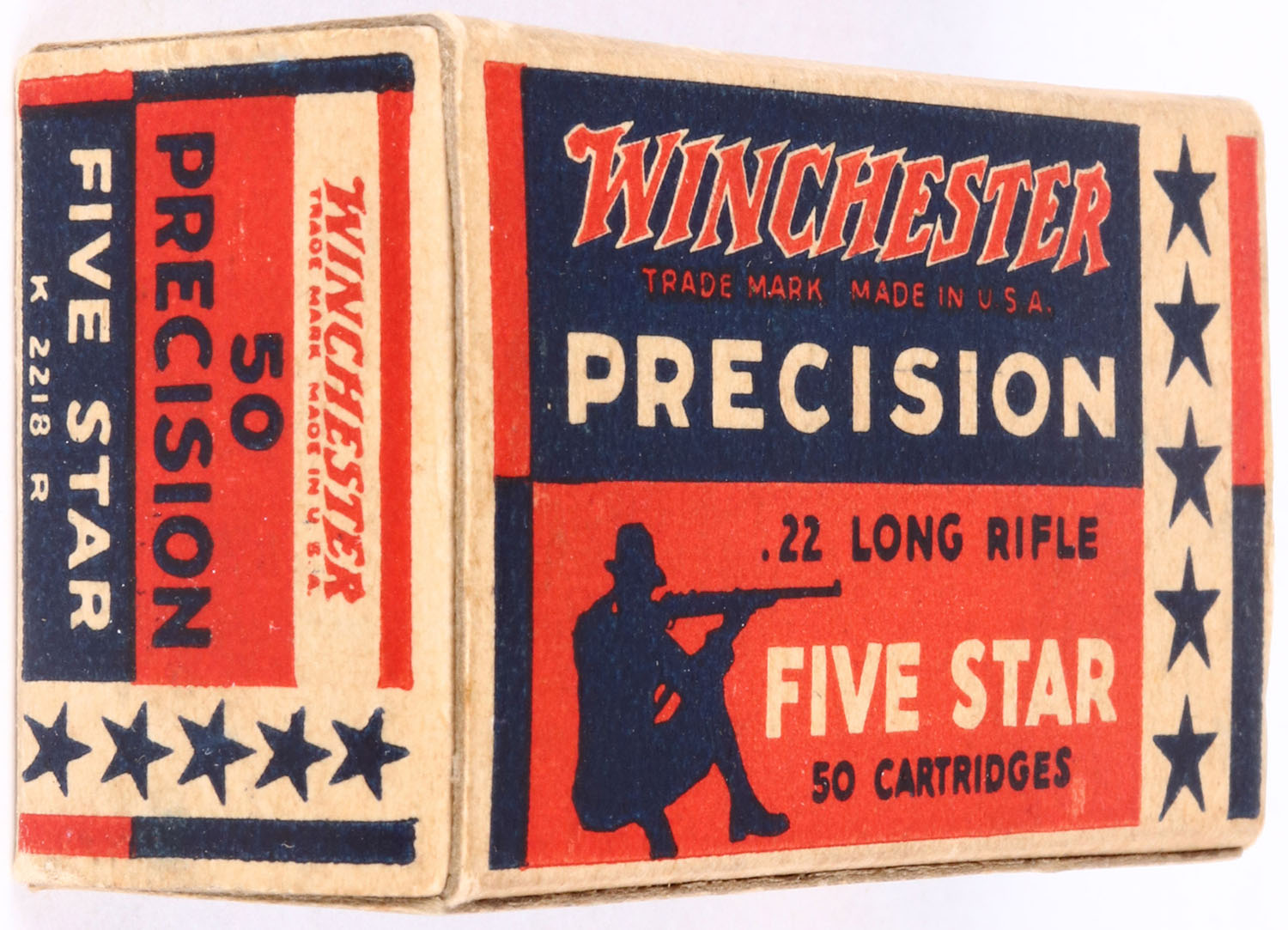 Winchester, Precision Five Star, .22 Long Rifle, RHWeb: WRA-53, LR-7b, Full, 2pc. Red blue & white box, box is solid with excellent color, some age soiling, very minor corner wear, edges are crisp, end flaps are solid, inside tray is excellent, ammo is excellent. Grade: Excellent ++ - Value: 100 to 300