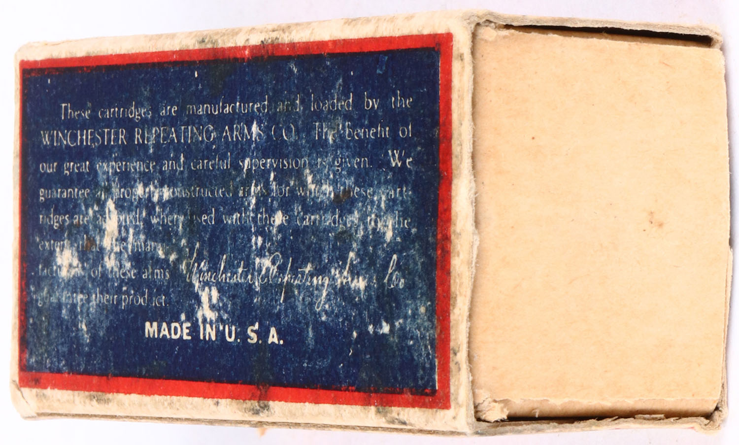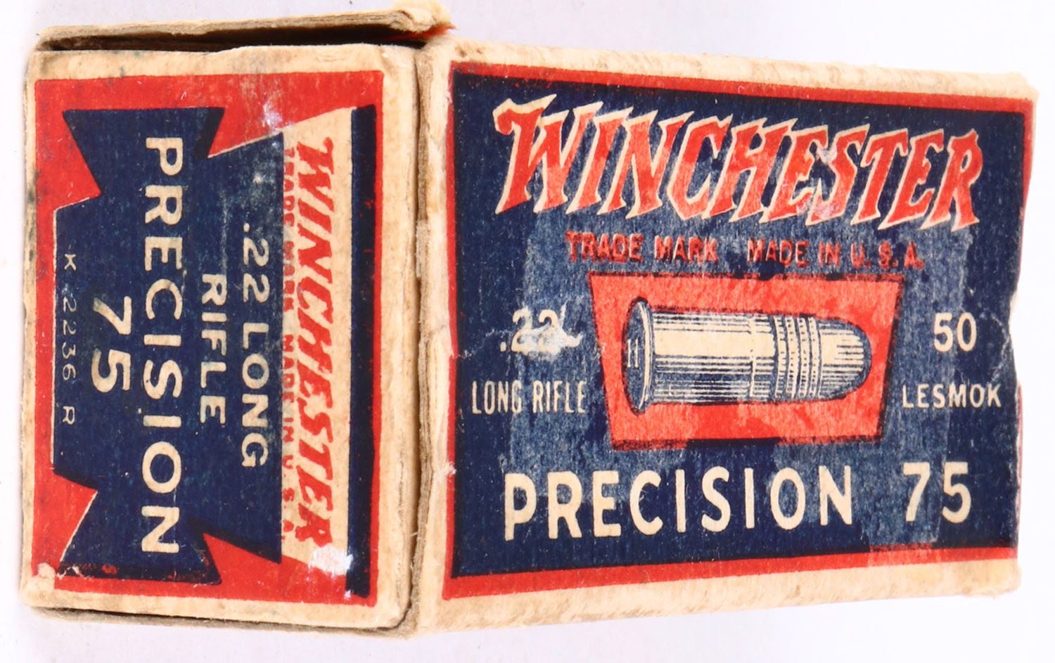 RARE! Winchester, Precision 75, .22 Long Rifle, RHWeb: WRA-53 LR-10, Partial 15rds. Correct, 1pc. Blue red & white box,, box is missing right end flap, has very good to excellent color, some age soiling, tape damage to top, some corner wear, edges are mostly crisp, left end flap is solid, ammo is very good. Grade: Good ++ - Value: 100 to 1000