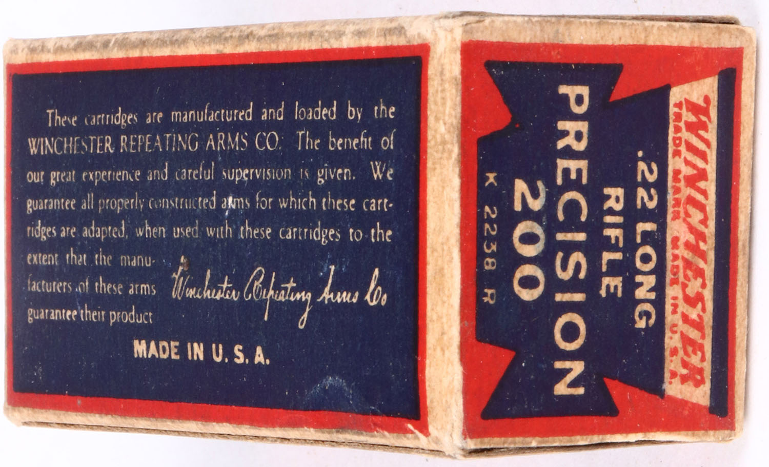 Winchester, Precision 200, .22 Long Rifle, Lesmok, RHWeb: WRA-53 LR-11d, Full, 1pc. Blue red & white box, box is solid with excellent colors, age soiling, very minor edge & corner wear, ammo is excellent. Grade: Excellent + - Value: 50 to 150