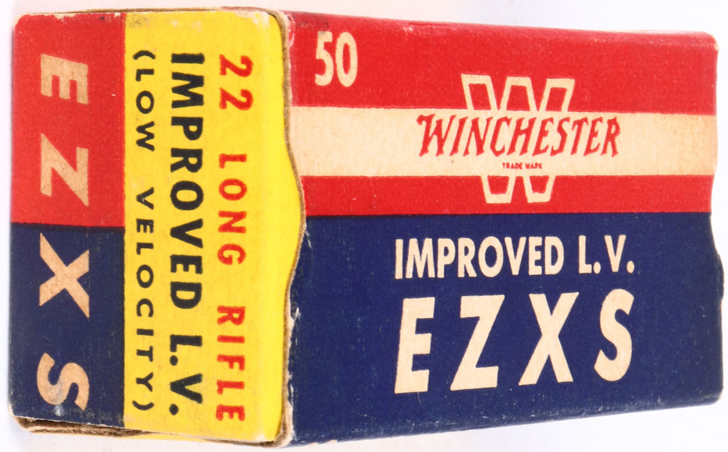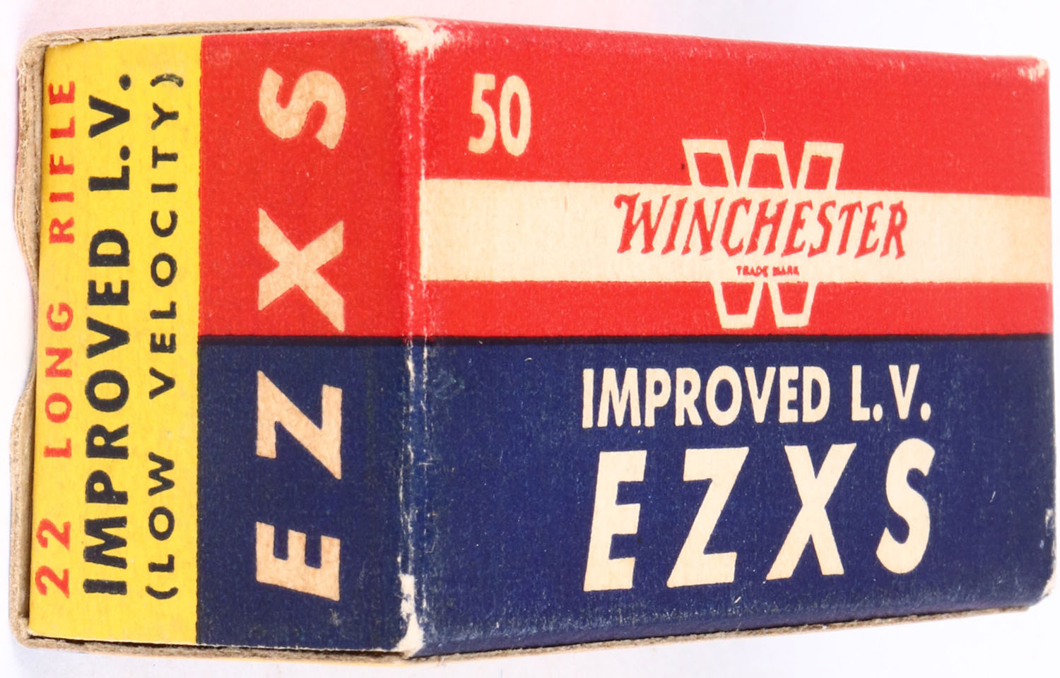 Winchester, Improved L.V. EZXS, .22 Long Rifle, RHWeb: WRA-54 LR-8a, Full, 1pc. Yellow blue & red box, box is solid with excellent color, minor age soiling, very minor corner wear, edges are crisp, end flaps are solid, ammo is excellent. Grade: Excellent ++ - Value: 8 to 40