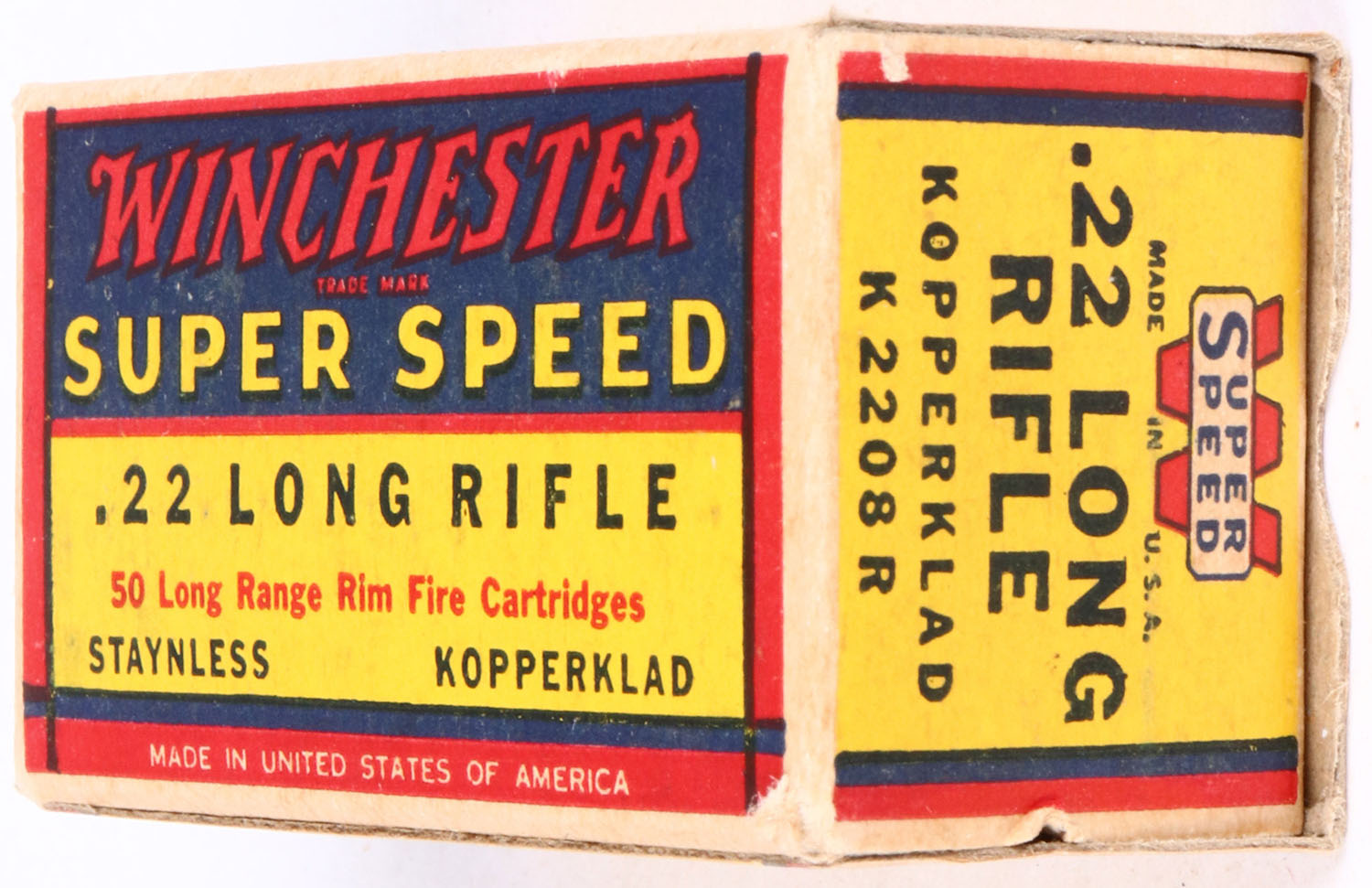 Winchester, Super Speed, .22 Long Rifle, RHWeb: WRA-15 LR-1b, Full, 1pc. Yellow blue & red box, box is solid with excellent color, very minor age soiling, corners are mostly sharp, edges are crisp, end flaps are solid, ammo is excellent. Grade: Excellent + - Value: 6 to 30