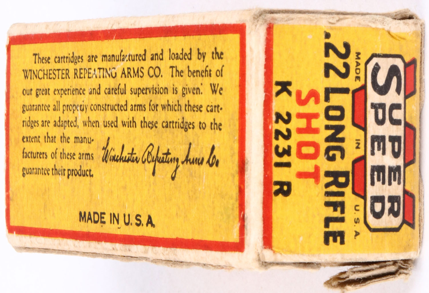 Winchester, Super Speed, .22 Long Rifle Shot, RHWeb: WRA-14A, LR-4b Full, 1pc. Yellow red & black box, box is solid with very good to excellent color, some age soiling, some edge & corner wear, end flaps are solid, ammo is excellent. Grade: Excellent - Value: 100 to 300