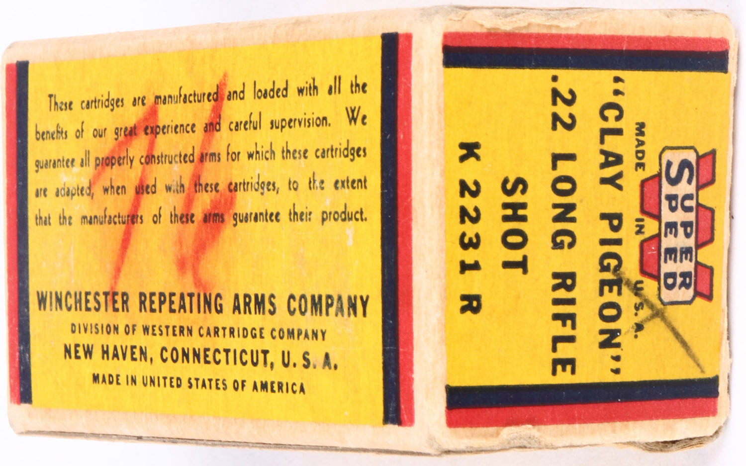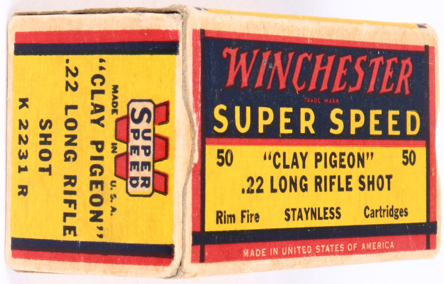 Winchester, Super Speed ''Clay Pigeon'', .22 Long Rifle Shot, RHWeb: WRA-15 LR-5b, Full, 1pc. Yellow blue & red box, box is solid with excellent color, only very minor age soiling & corner wear, edges are crisp, end flaps are solid, ammo is excellent. Grade: Excellent + - Value: 10 to 50