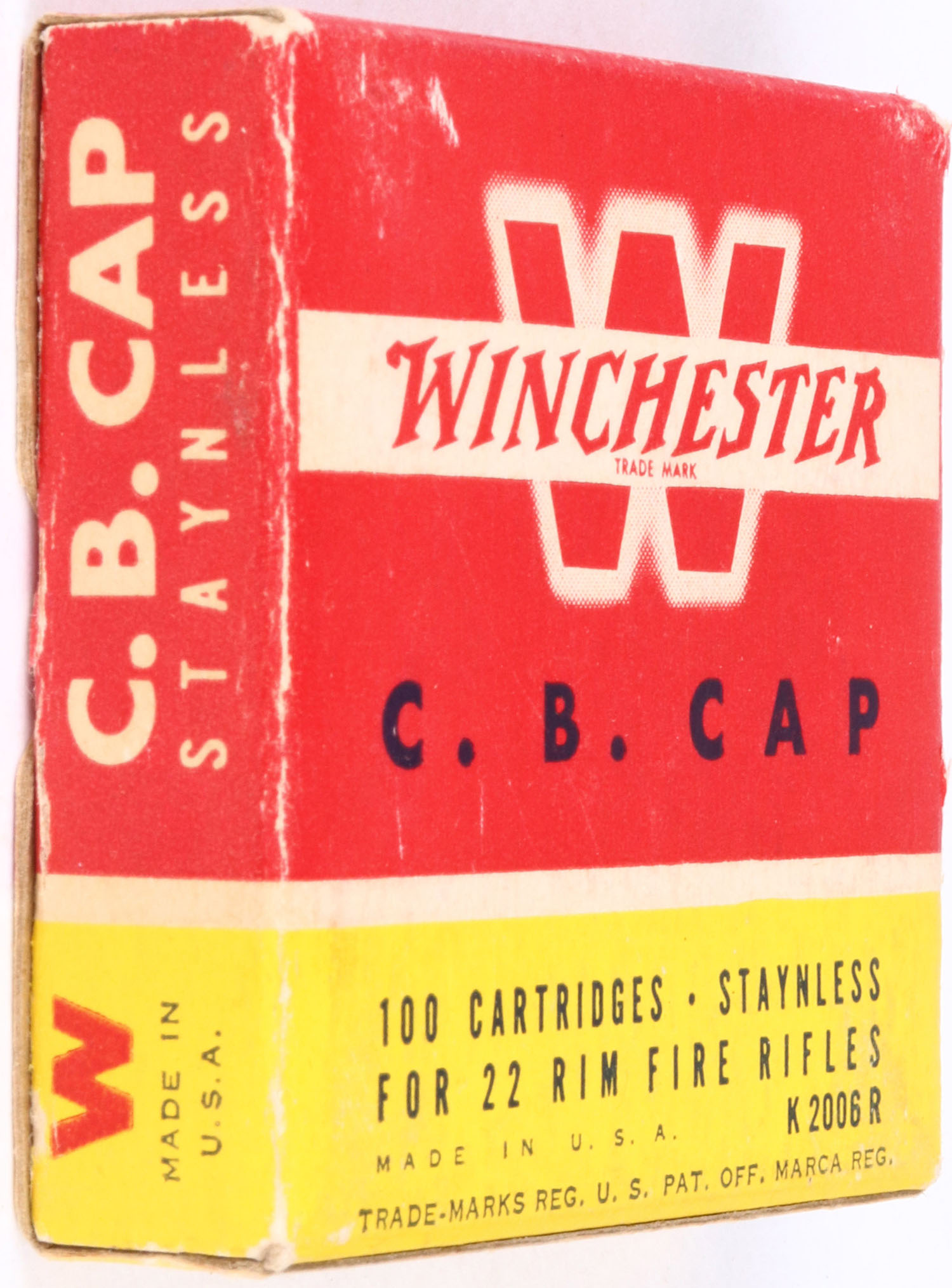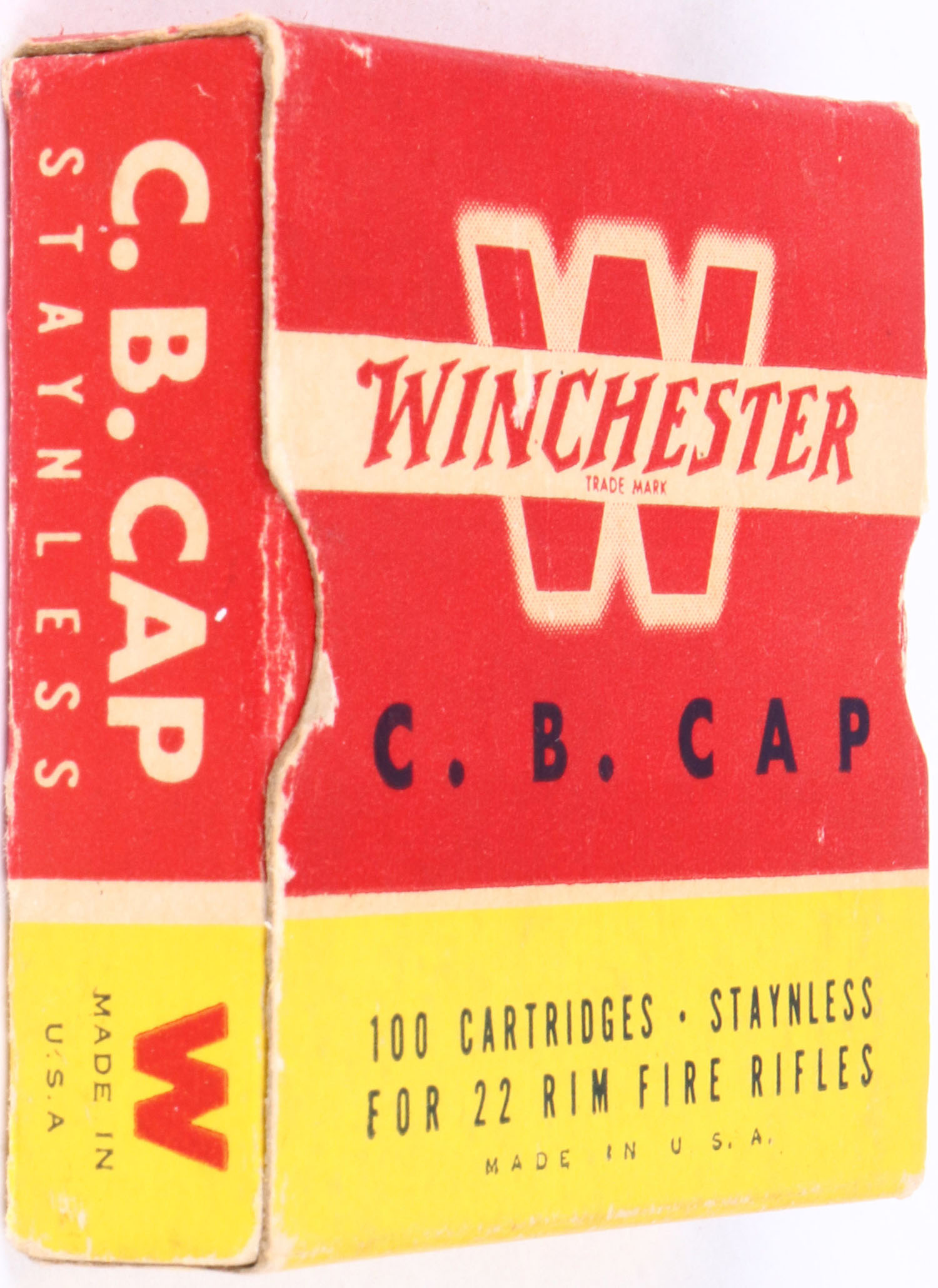 Winchester, Staynless, .22 C.B. Caps, RHWeb: WRA-17 CB-1a, Full, 1pc. Red yellow & white box, box is solid with excellent color, very minor age soiling & shelf wear, very minor corner wear, edges are mostly crisp, end flaps are solid, ammo is excellent. Grade: Excellent + - Value: 20 to 100