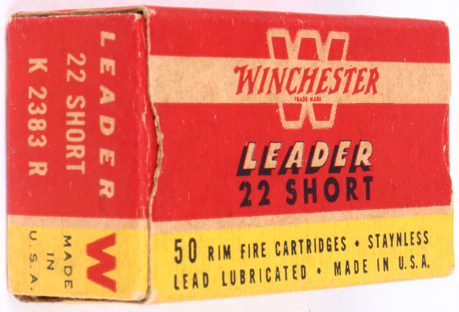 Winchester, Leader, .22 Short, RHWeb: WRA-55, S-2a, Full, 1pc. Red yellow & white box, box is solid with very good to excellent color, age soiling, corners are mostly sharp, edges are crisp, end flaps are solid, ammo is excellent. Grade: Excellent - Value: 6 to 30