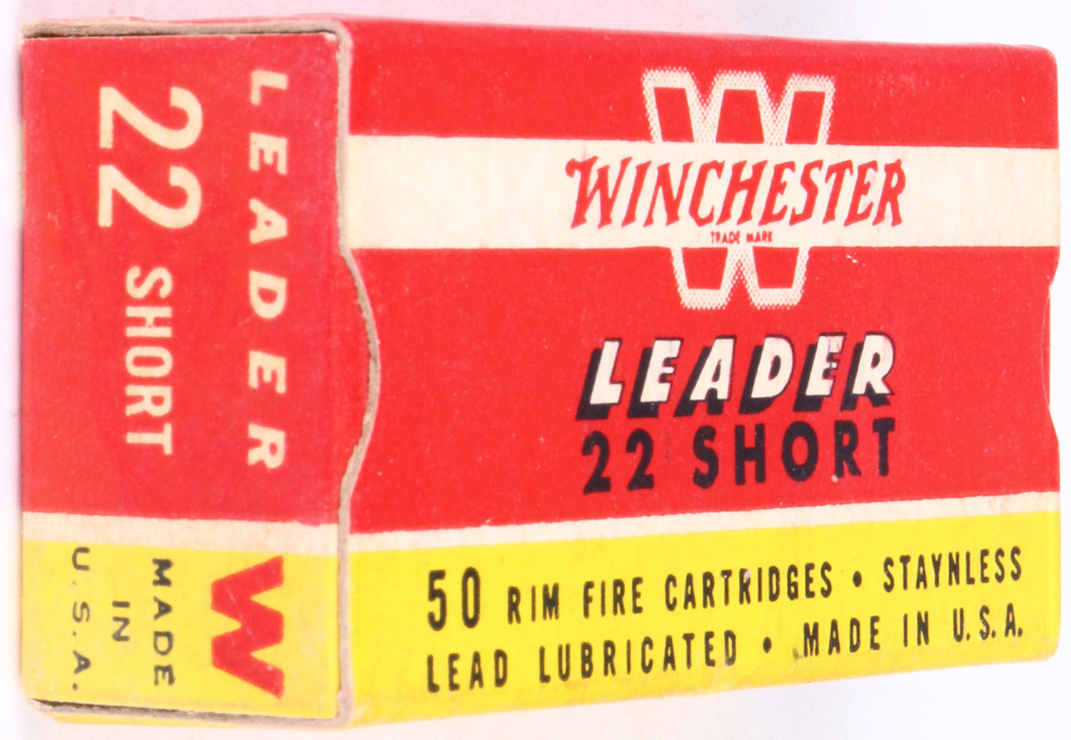 Winchester, Leader, .22 Short, RhWeb: WRA-55 S-2c, Full, 1pc. Red yellow & white box, box is solid with excellent color, only very minor age soiling & color bleeding, corners are sharp, edges are crisp, end flaps are solid, ammo is very good to excellent. Grade: Excellent ++ - Value: 10 to 50