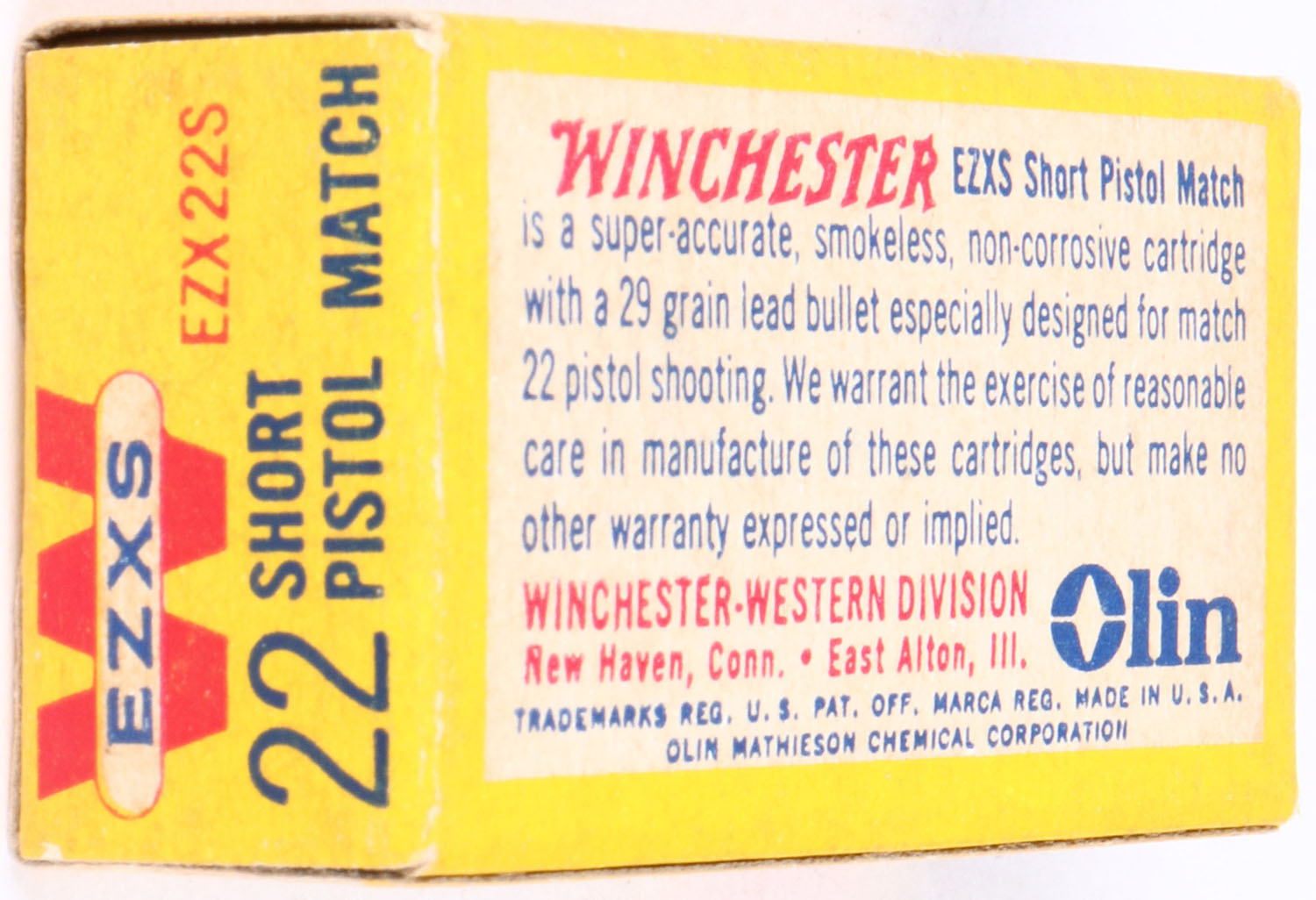 Winchester, EZXS, .22 Short, Pistol Match, RHWeb: WRA-54 S-1, Full, 1pc. Yellow red & white box, box is solid with excellent color, some age soiling, corners are mostly sharp, edges are crisp, end flaps are solid, ammo is excellent. Grade: Excellent ++ - Value: 10 to 50