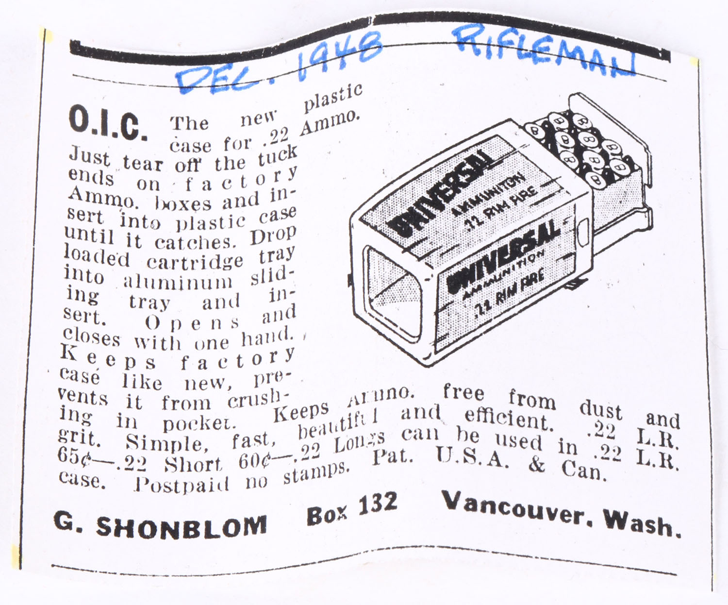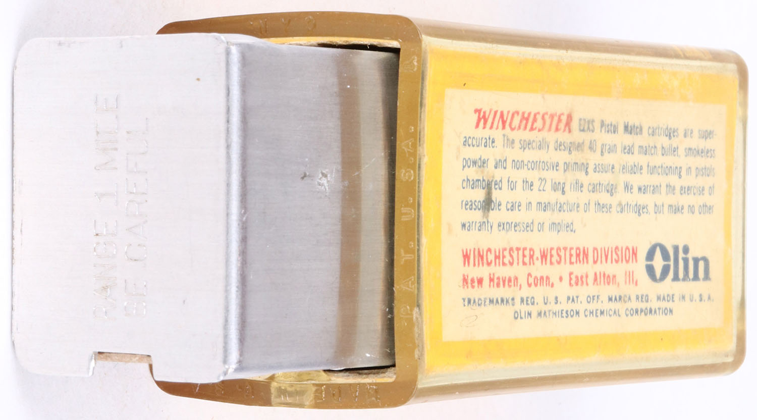 Winchester (inside box), EZXS, .22 Long Rifle, Pistol Match, RHWeb: WRA-54 LR-9, Empty, 1pc. Yellow red & white box inside an O.I.C. Plastic case from the 1940's with a sliding aluminum tray, comes with a copy of an advertisement clipping from Rifleman Magazine, inside box is missing both end flaps, excellent color, some age soiling, edges are crisp, corners are sharp, plastic case is solid with excellent color, some cloudiness to plastic, tray is solid. Grade: Excellent - Value: 6 to 60