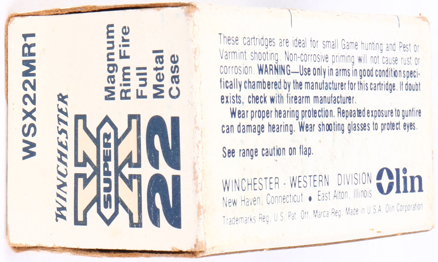 Winchester, Super X, .22 Magnum Rim Fire, Full Metal Case, Not in RHWeb, Similar to RHWeb: WRA-21 WMR-1 - only with a different style of child warning, Full, 1pc. White blue & yellow box, box is solid with excellent color, very minor age soiling & color fading, very minor edge & corner wear, end flaps are solid, ammo is excellent. Grade: Excellent - Value: 10 to 50