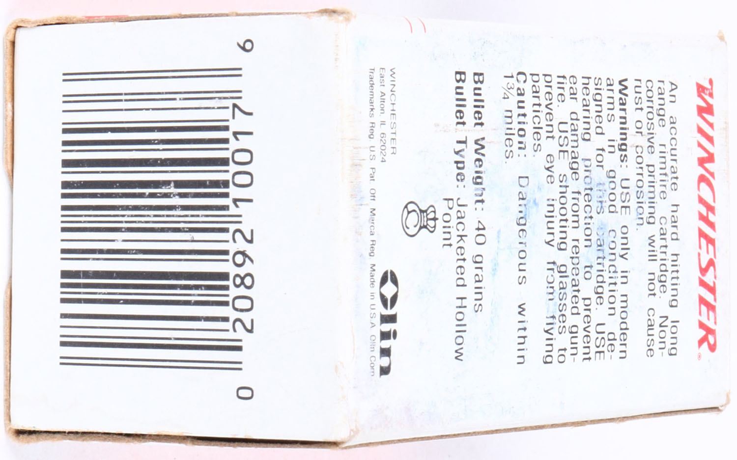 Winchester, Super-X, .22 Magnum Hollow Point, RHWeb: WRA-H&R-1C WMR-2, Full, 1pc. Off-white red & orange box, box is solid with excellent color, very minor age soiling, sticker residue on top, very minor shelf & corner wear, edges are mostly crisp, end flaps are solid, ammo is minty. Grade: Excellent - Value: 10 to 50
