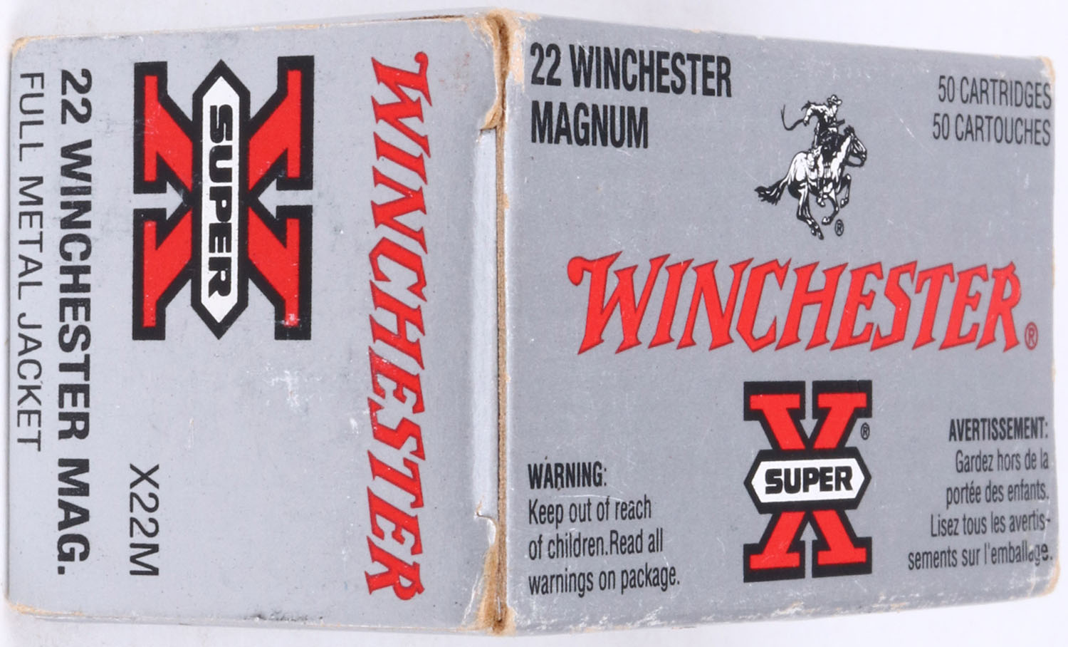 Winchester, Super X, .22 Winchester Magnum, 40 Grain FMJ, RHWeb: WRA-H&R-40 WMR-2, Full, 1pc. Silver black & red box, box is solid with excellent color, very minor shelf & edge wear, minor corner wear, end flaps are solid, ammo is excellent. Grade: Excellent + - Value: 8 to 40