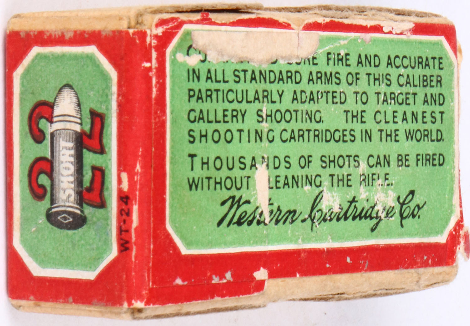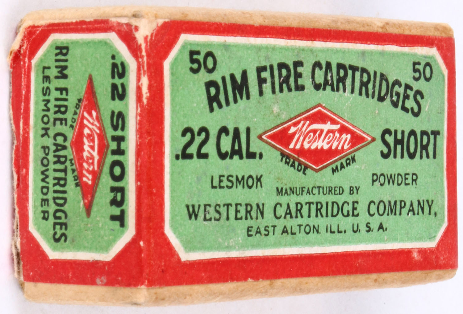 Western, .22 Short, Lesmok Powder, RHWeb: WCC-3 S-2b, Full, 2pc. Buff box with green & red wraparound label, box is solid with excellent color, shelf wear, on bottom, very minor corner wear, tear to front of box, edges are crisp, label is intact, ammo is excellent. Grade: Excellent - Value: 30 to 90