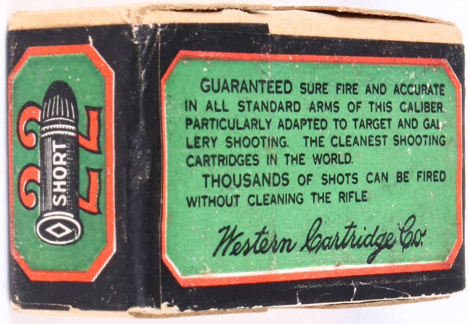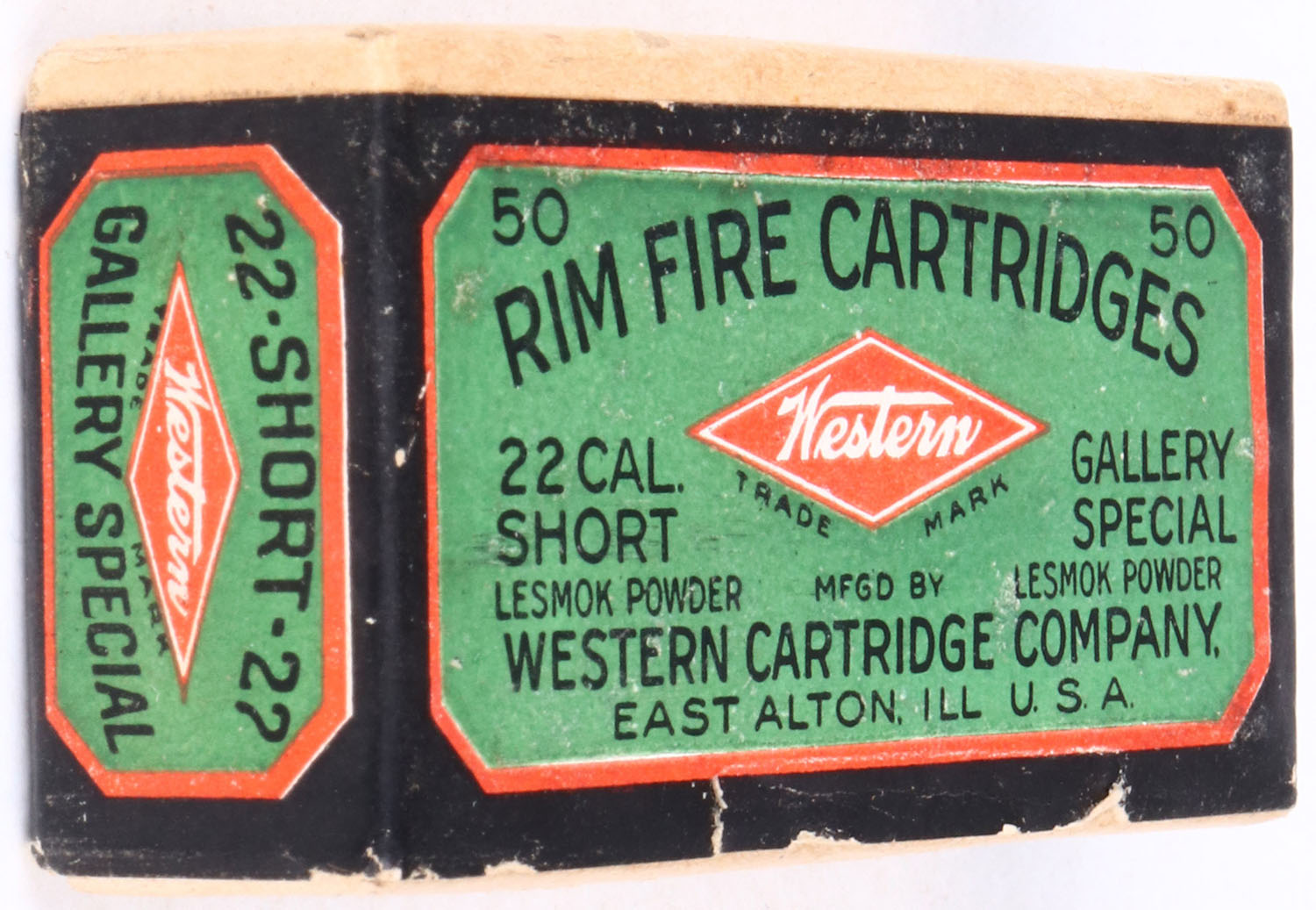 Western, Gallery Special, .22 Short, Lesmok Powder, RHWeb: WCC-48 S-5, FULL & SEALED, 2pc. Buff box with green black & red wraparound label, box is solid with excellent color, very minor chipping to front side of label, corners are mostly sharp, edges are crisp, labels are intact. Grade: Excellent ++ - Value: 50 to 150