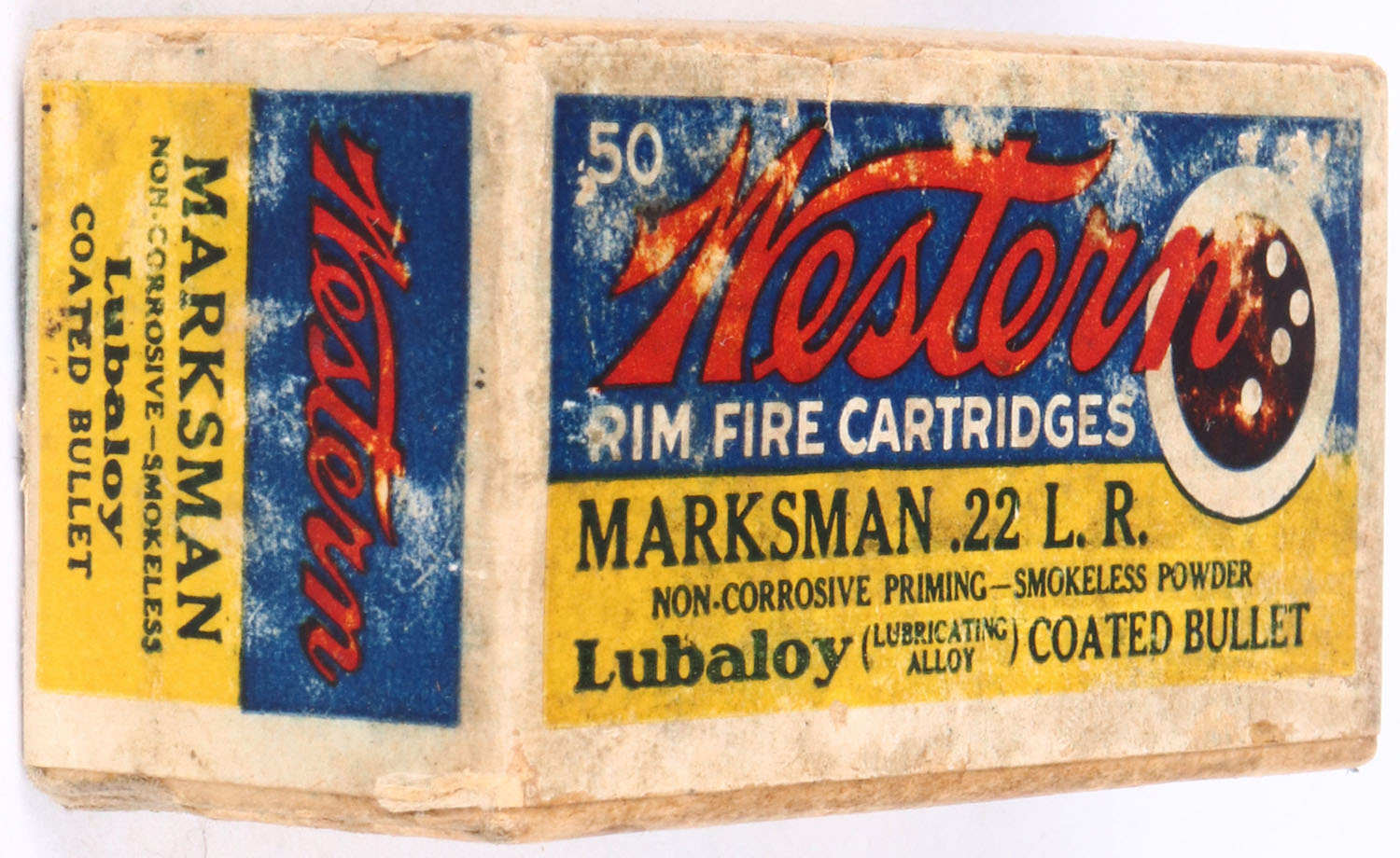Western, Marksman .22 L.R., .22 Long Rifle, Lubaloy (Lubricating Alloy) Coated Bullet, RHWeb: WCC-50 LR-7 Full, 2pc. Buff box with multi-colored wraparound bullseye label, box is solid with good to very good color, shelf wear, some age soiling, staining to front and bottom, very minor corner wear, edges are mostly crisp, label is intact. Grade: Very Good + - Value: 20 to 60