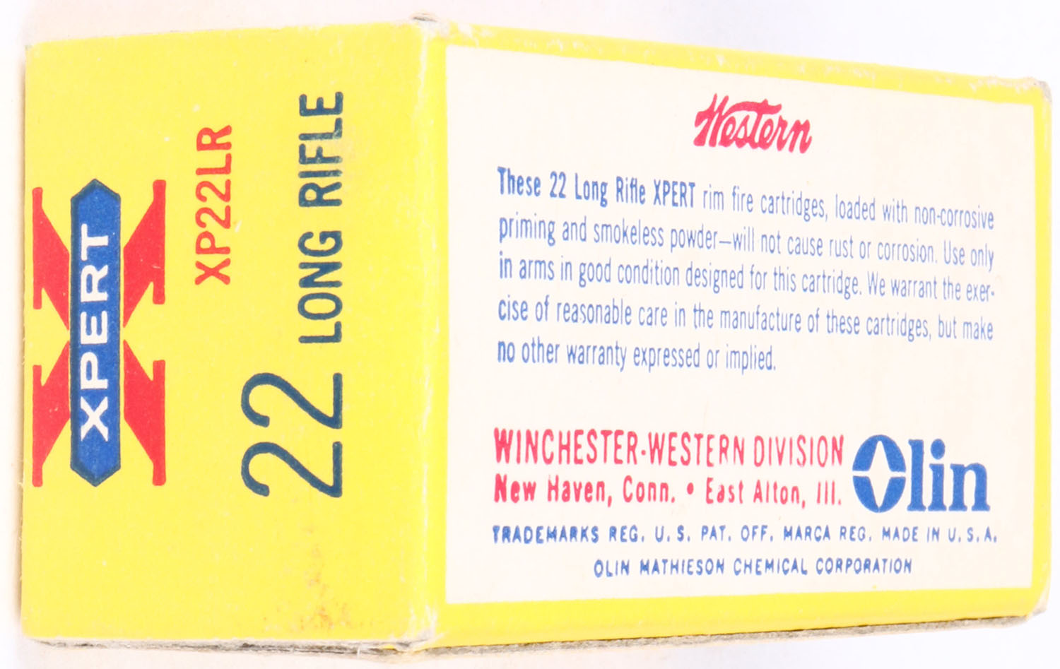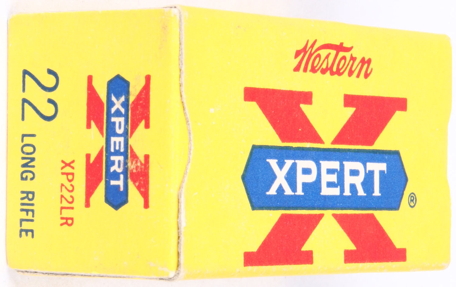 Western, Xpert, .22 Long Rifle, RHWeb: WCC-52 LR-2b, Full, 1pc. Yellow red & blue box, box is MINT with minty color, corners are sharp, edges are crisp, end flaps are solid, ammo is excellent. Grade: MINT - Value: 10 to 50