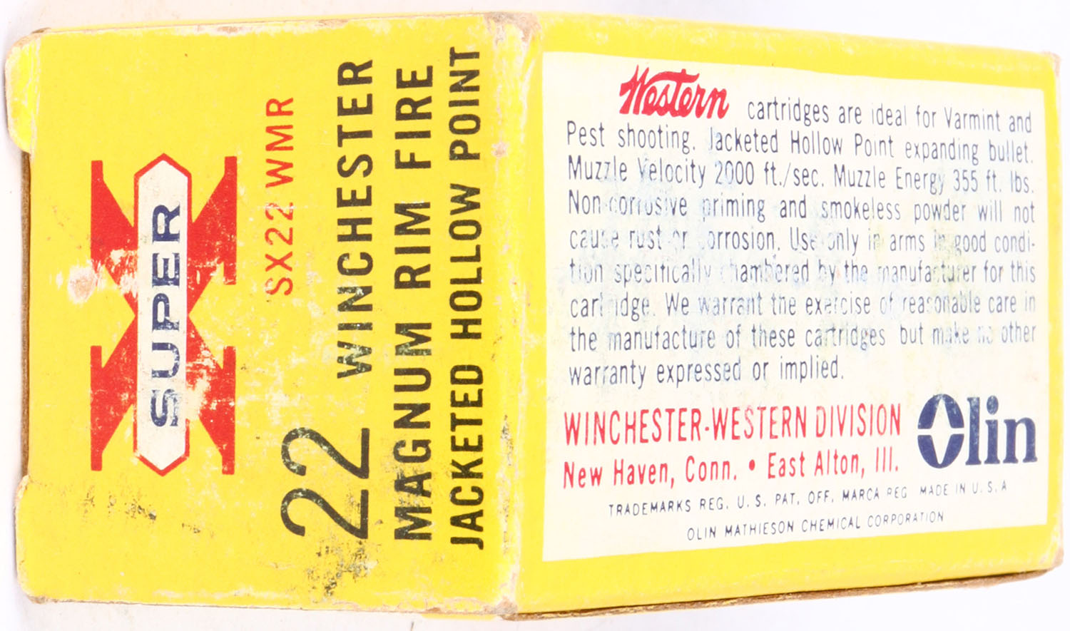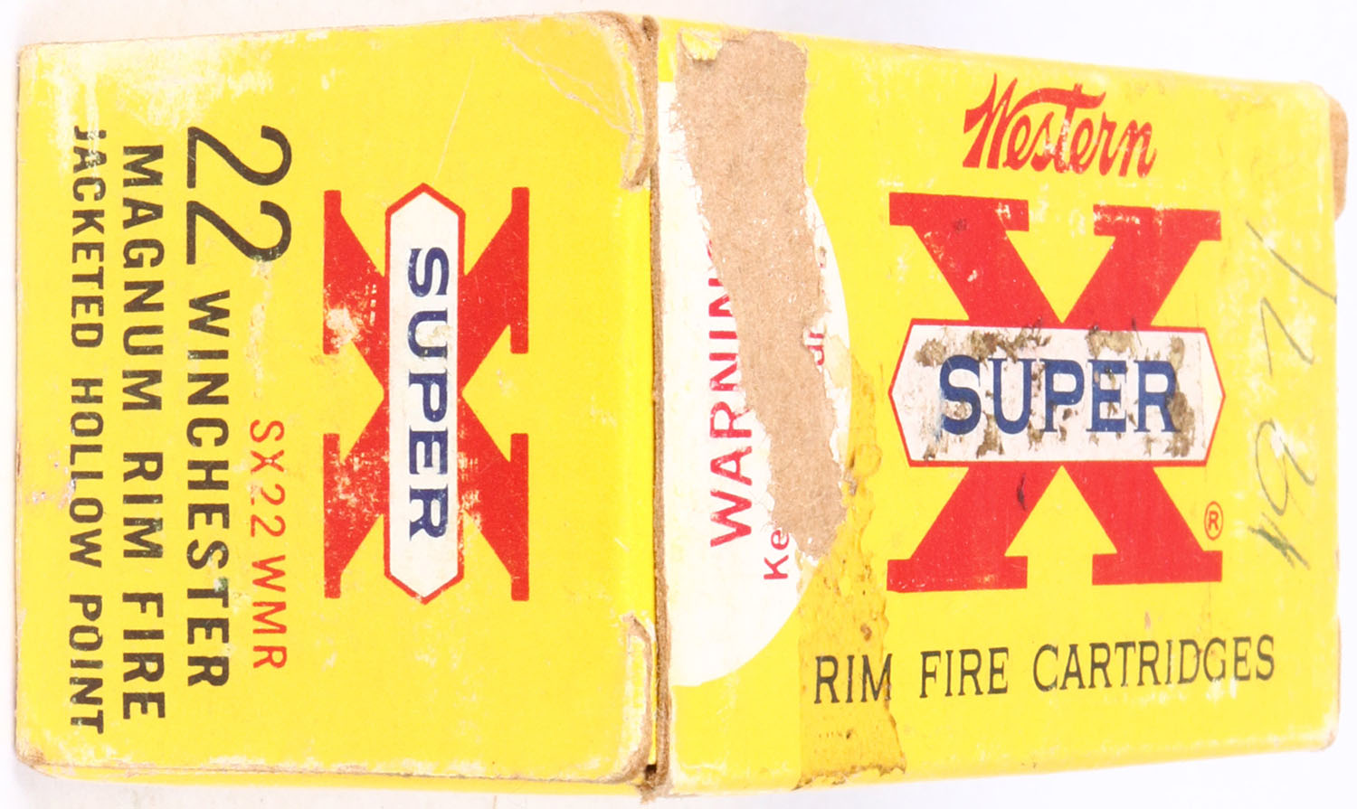 Western, Super X, .22 Winchester Magnum Rim Fire, 40 Grain Jacketed Hollow Point, RHWeb: WCC-12 WMR-1a, Full, 1pc. Yellow red & white box, box is solid with very good to excellent color, minor age soiling, peeling & tape residue on top, top has been written on, minor shelf wear, very minor corner wear, edges are mostly crisp, end flaps are solid, ammo is excellent. Grade: Very Good + - Value: 8 to 40