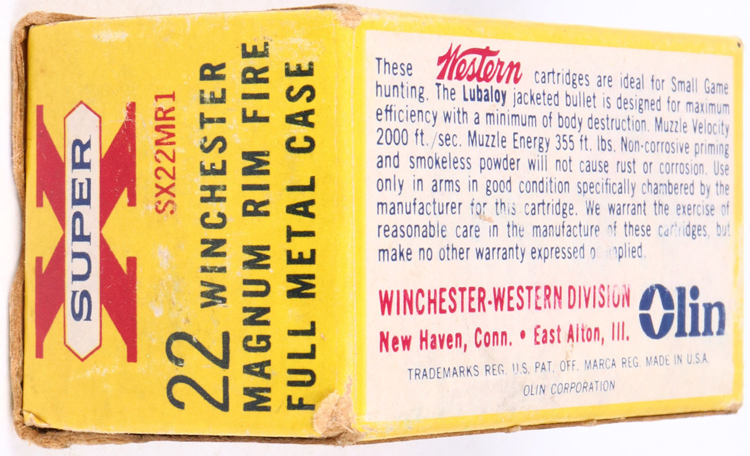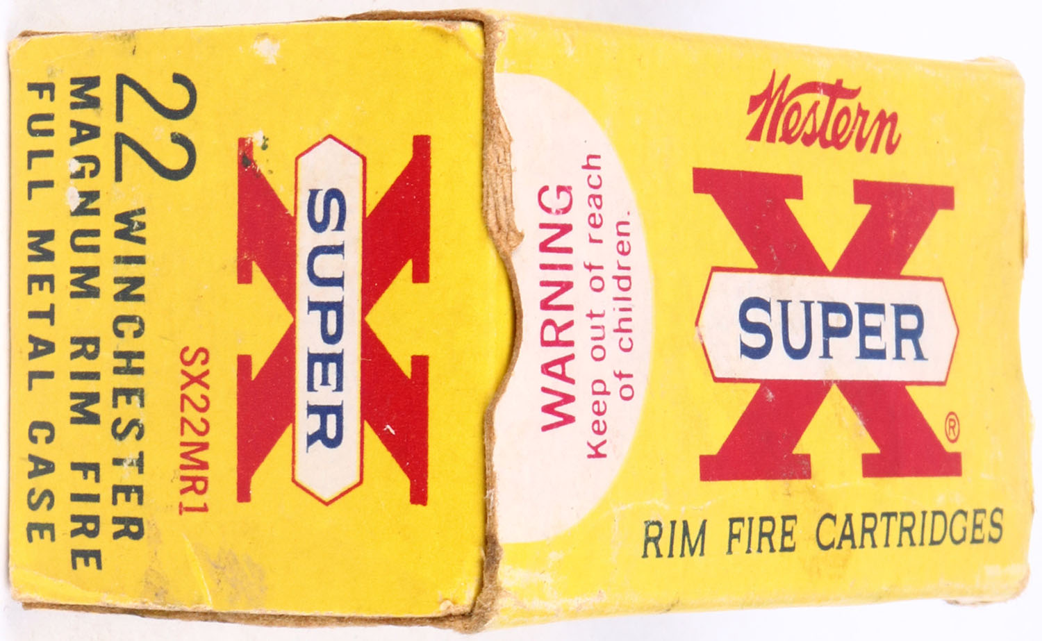 Western, .22 Winchester Magnum Rim Fire, 40 Grain Full Metal Case, RHWeb: WCC-12 WMR-3, Full, 1pc. Yellow red & white box, box is solid with very good color, some age soiling, minor corner wear, very minor edge wear, end flaps are solid, ammo is excellent. Grade: Excellent - Value: 10 to 50