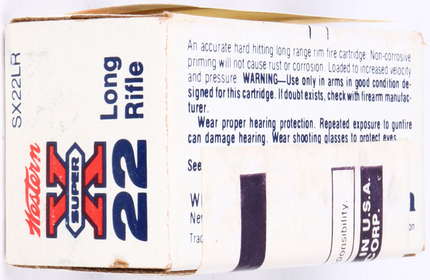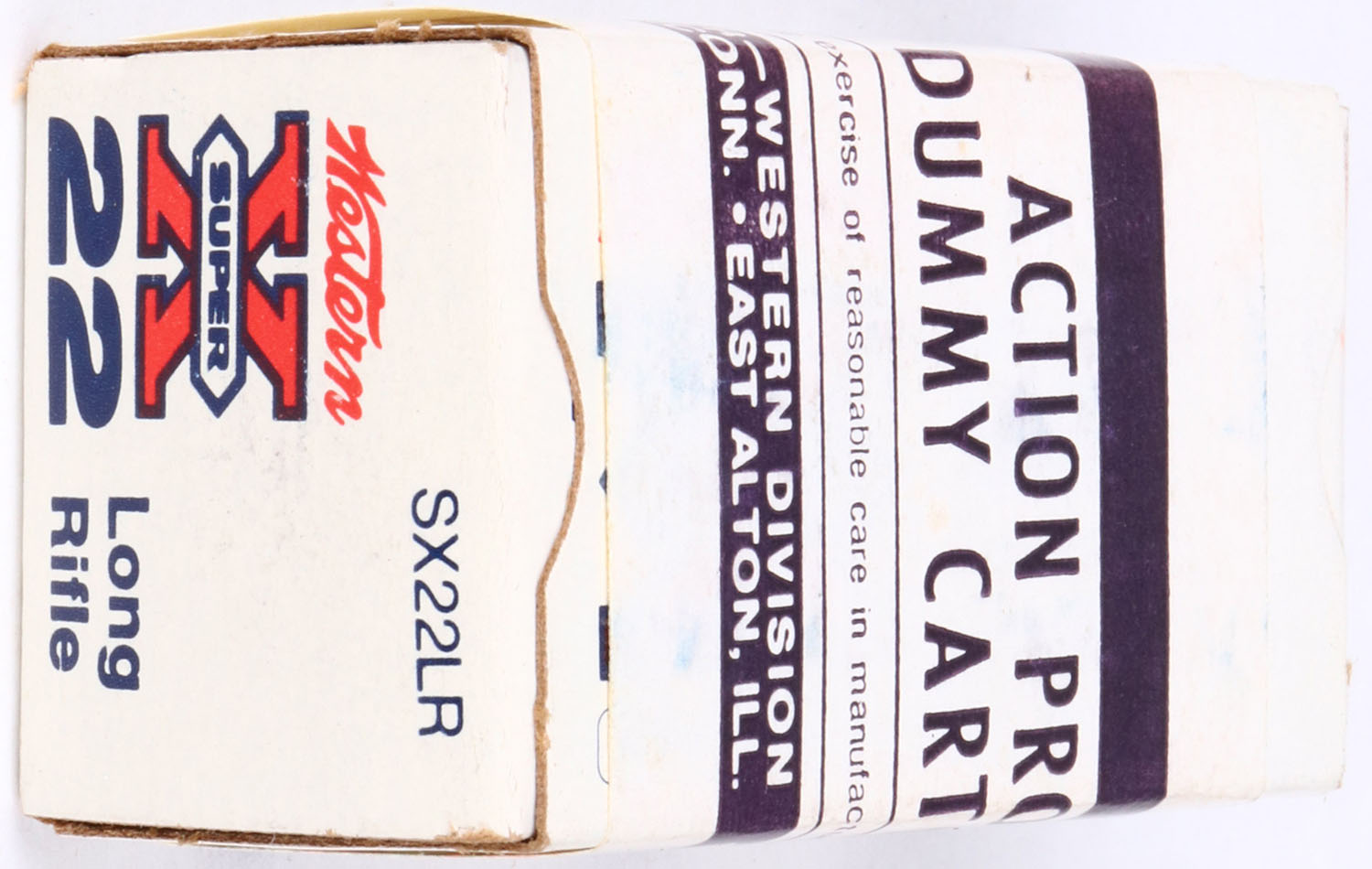 Western, Super X Extra Power, .22 Long Rifle Action Proving Dummy Cartridges, Not in RHWeb, Full, 1pc. White red & black with black & white over-label, box is solid with excellent to minty color, some peeling to over-label, only very minor corner wear, some color bleeding, edges are crisp, end flaps are solid, ammo is minty. Grade: Excellent + - Value: 6 to 30