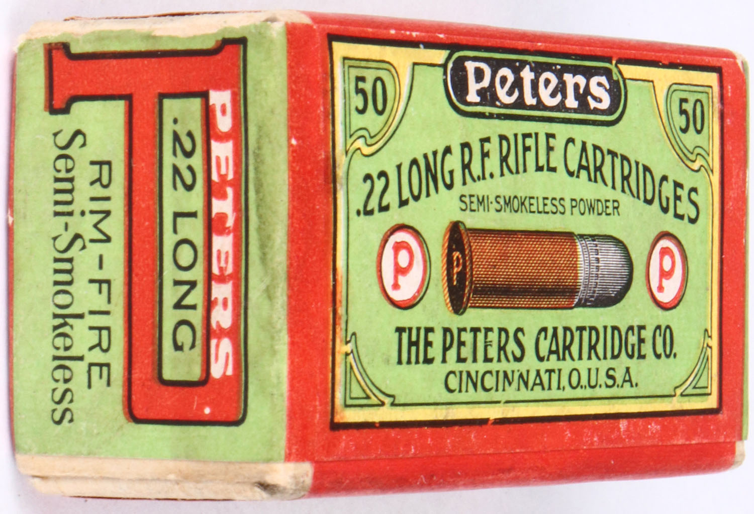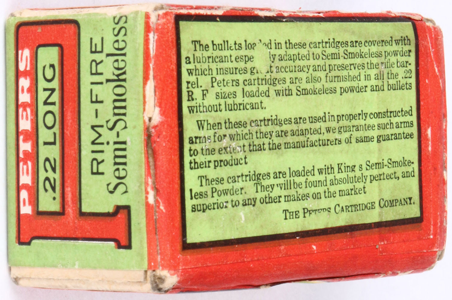 Peters, .22 Long, Semi-Smokeless Powder, RHWeb: PCC-5A L-1a, FULL & SEALED, 2pc. Buff box with multi-colored full wraparound label, box is solid with excellent to minty color, very minor corner wear, edges are crisp, label is intact, box feels very slightly swollen. Grade: Excellent ++ - Value: 50 to 150