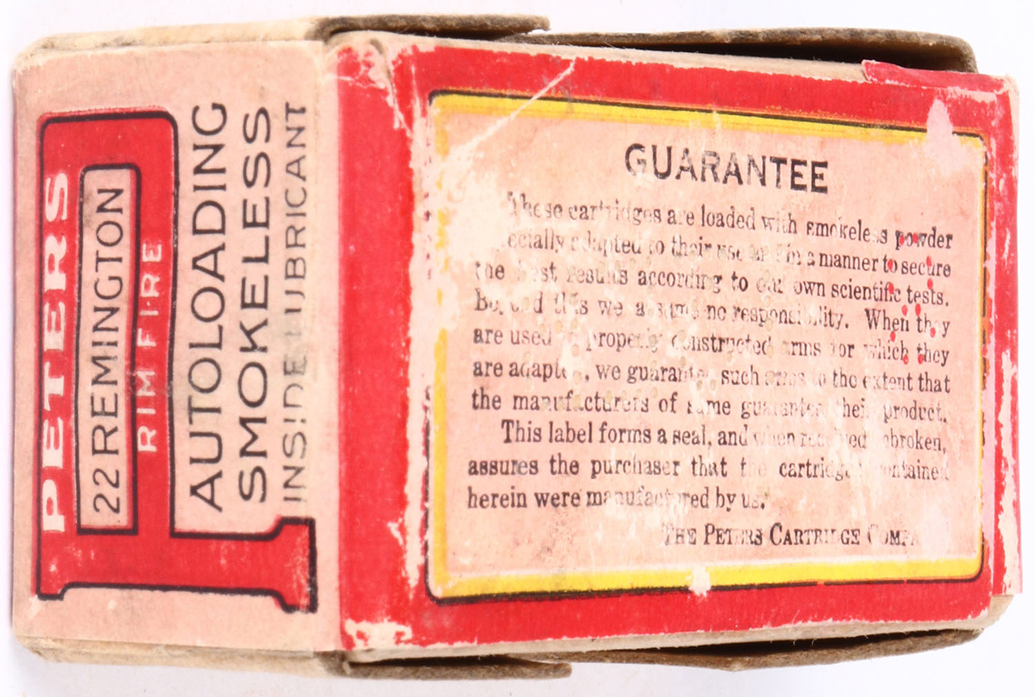 Peters, .22 Remington Autoloading, Smokeless, RHWeb: PCC-5A RA-1, FULL & SEALED, 2pc. Buff box with salmon & red wraparound label, box is solid with very good color, some age soiling, tear to top label, top has been written on, minor corner wear, very minor edge wear, label is 95% intact. Grade: Very Good ++ - Value: 50 to 150