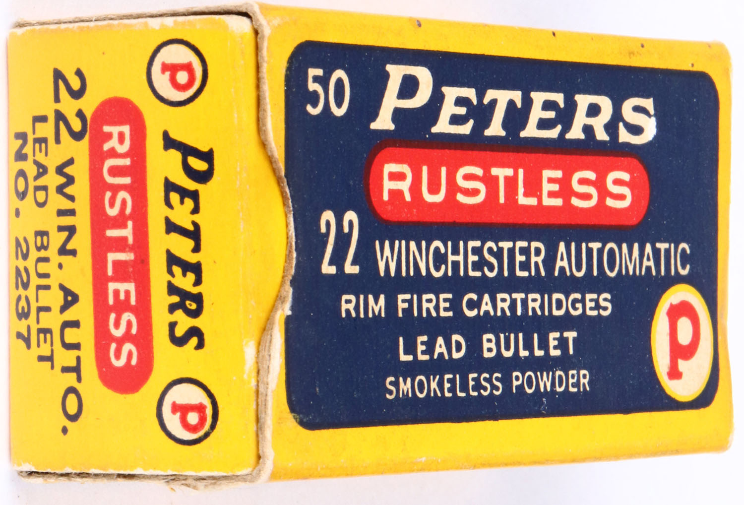 Peters, Rustless, .22 Winchester Automatic, Bridgeport, RHWeb: PCC-8D WA-3c, Partial 40rds., 1pc. Blue yellow and red box, box is solid with excellent color, front has been written on, minor corner wear, edges are mostly crisp, end flaps are solid, ammo is minty. Grade: Excellent + - Value: 4 to 40