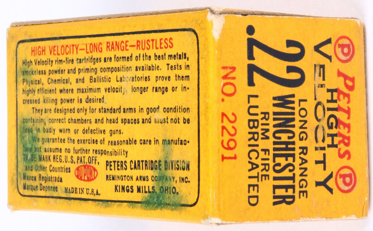 Peters, High Velocity Long Range, .22 Winchester Rim Fire, RHWeb: PCC-11B WRF-1, Full, 1pc. Yellow blue & red box, box is solid with very good to excellent color, very minor age soiling, very minor edge & corner wear, end flaps are solid, ammo is minty. Grade: Excellent + - Value: 20 to 60