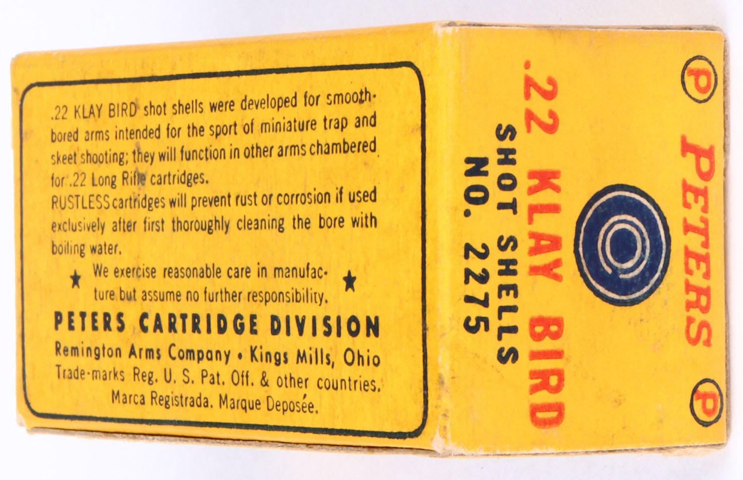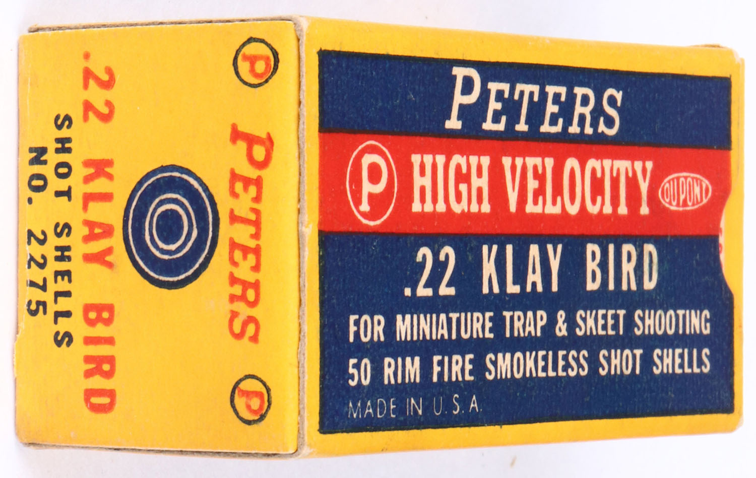 Peters, High Velocity .22 Klay Bird, .22 Long Rifle Shot, RHWeb: PCC-14 LR-4, Full, 1pc. Blue yellow & red box, box is near mint with excellent color, only very minor age soiling, corners are sharp, edges are crisp, end flaps are solid, ammo is excellent. Grade: Excellent ++ - Value: 100 to 300