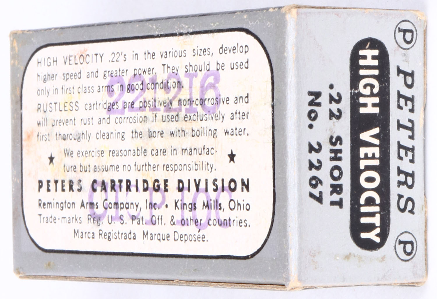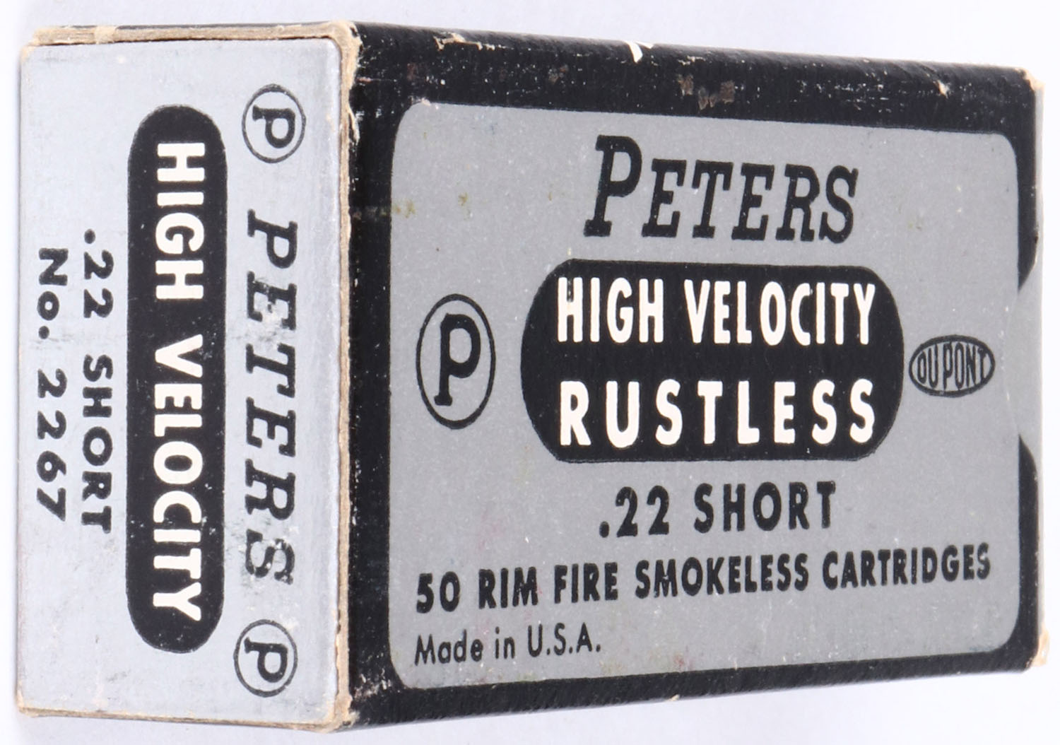 Peters, High Velocity Rustless, .22 Short, RHWeb: PCC-14 S-1aa, Full, 1pc. Silver black & white box, box is solid with excellent color, very minor corner wear, edges are crisp, end flaps are solid, ammo is excellent. Grade: Excellent ++ - Value: 30 to 90