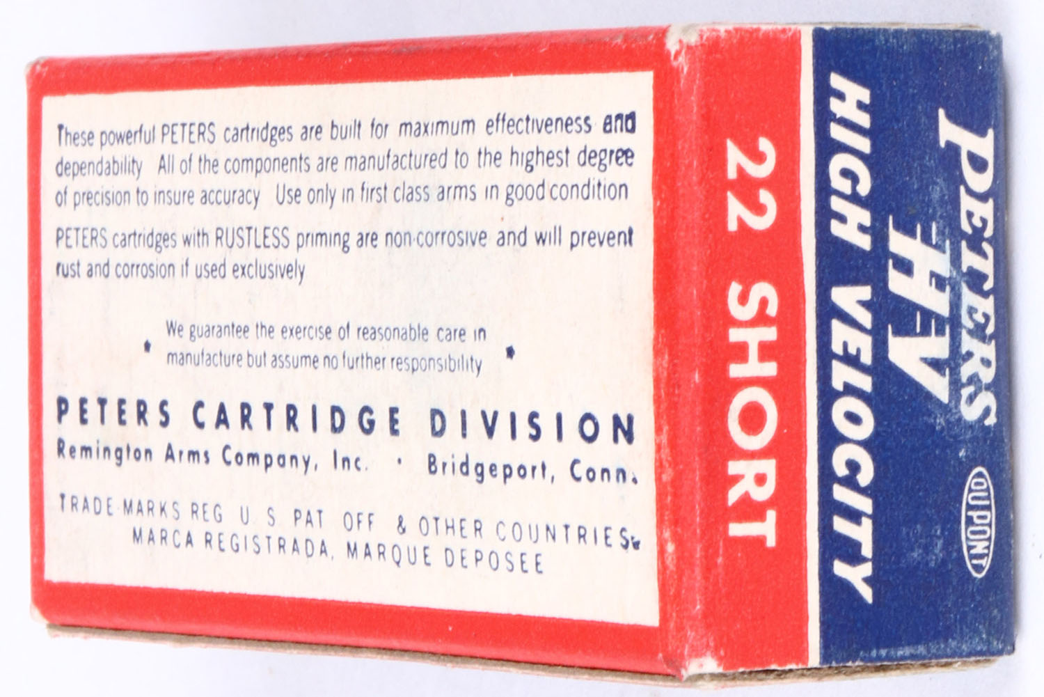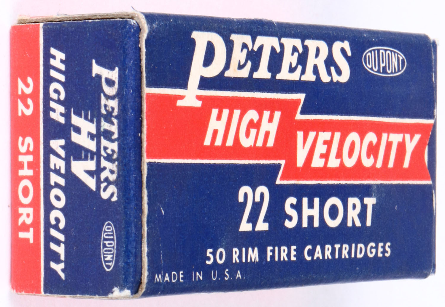 Peters, High Velocity, .22 Short, RHWeb: PCC-17 S-1d, Full, 1pc. Blue red & white box, box is solid with excellent color, very minor corner wear, edges are mostly crisp, end flaps are solid, ammo is excellent. Grade: Excellent + - Value: 6 to 30