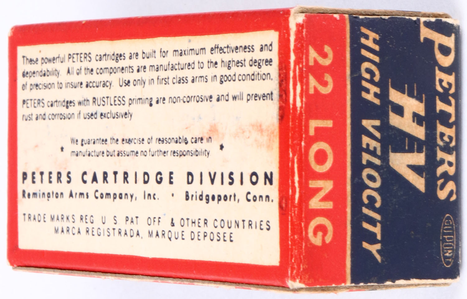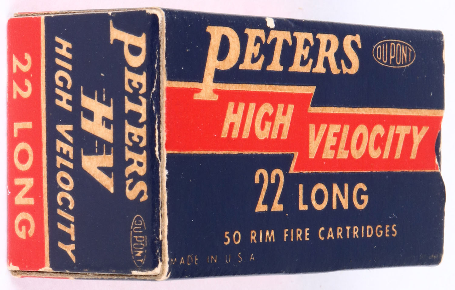 Peters, High Velocity, .22 Long, RHWeb: PCC-17 L-1d, Full, 1pc. Blue red & white box, box is solid with very good color, some age soiling, minor edge & corner wear, end flaps are solid, ammo is very good. Grade: Excellent - Value: 6 to 30