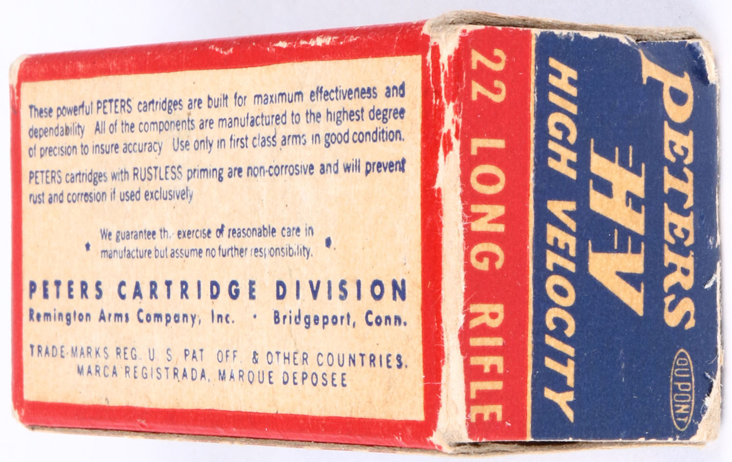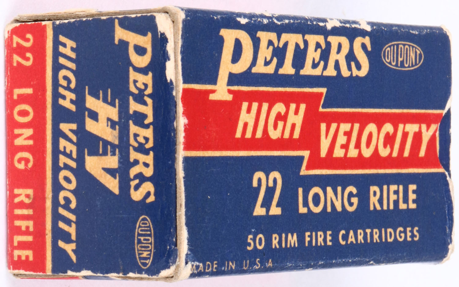 Peters, High Velocity, .22 Long Rifle, RHWeb: PCC-17 LR-1b, Full, 1pc. Blue red & white box, box is solid with very good to excellent color, minor age soiling, some edge & corner wear, end flaps are solid, ammo is excellent to minty. Grade: Excellent - Value: 10 to 50