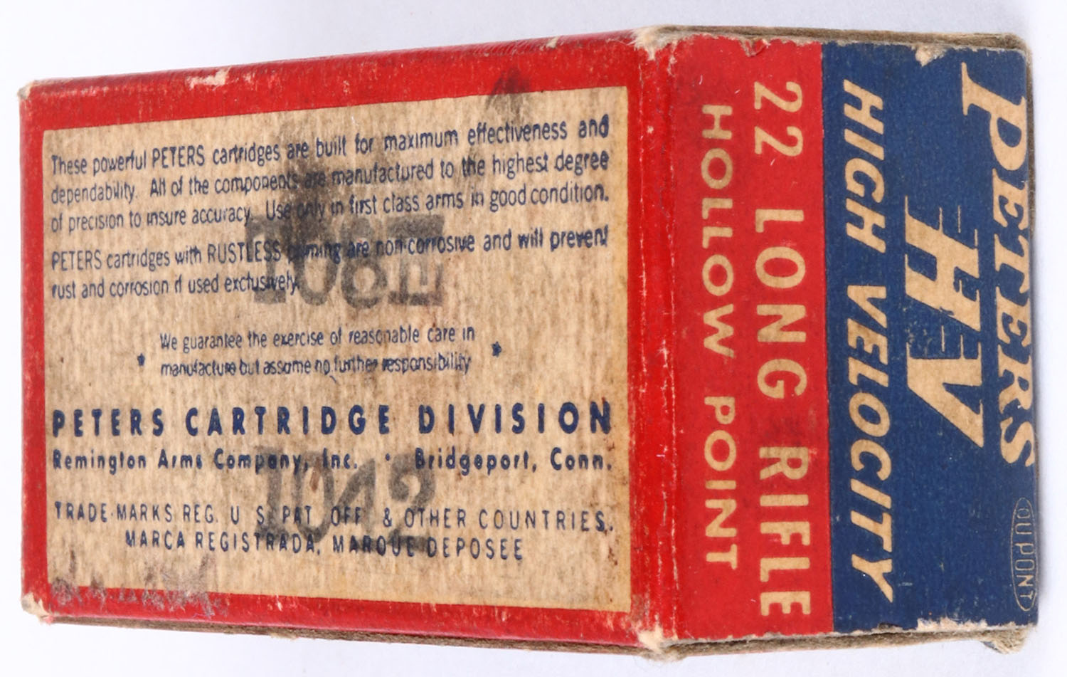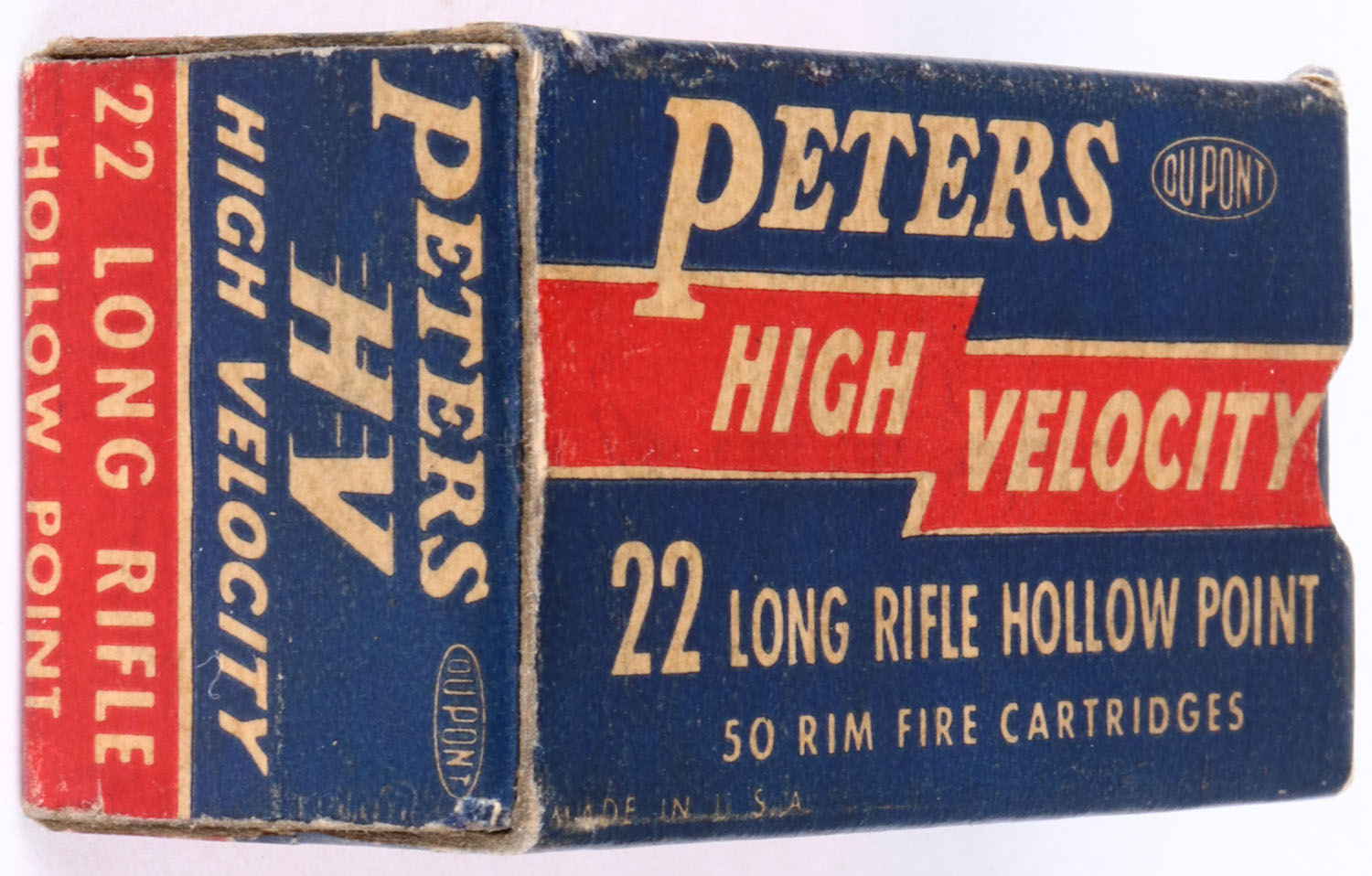 Peters, High Velocity, .22 Long Rifle Hollow Point, RHWeb: PCC-17 LR-3a, Full, 1pc. Blue red & white box, box is solid with very good color, some age soiling, very minor corner wear, edges are mostly crisp, end flaps are solid, ammo is excellent to minty. Grade: Excellent + - Value: 10 to 50