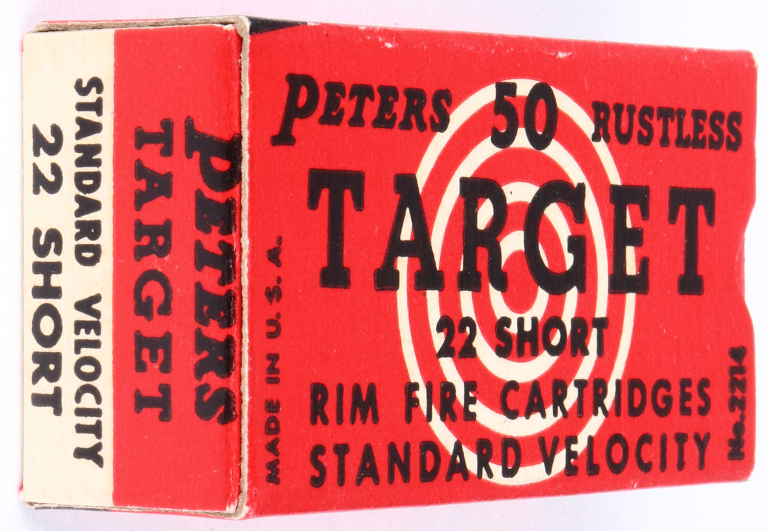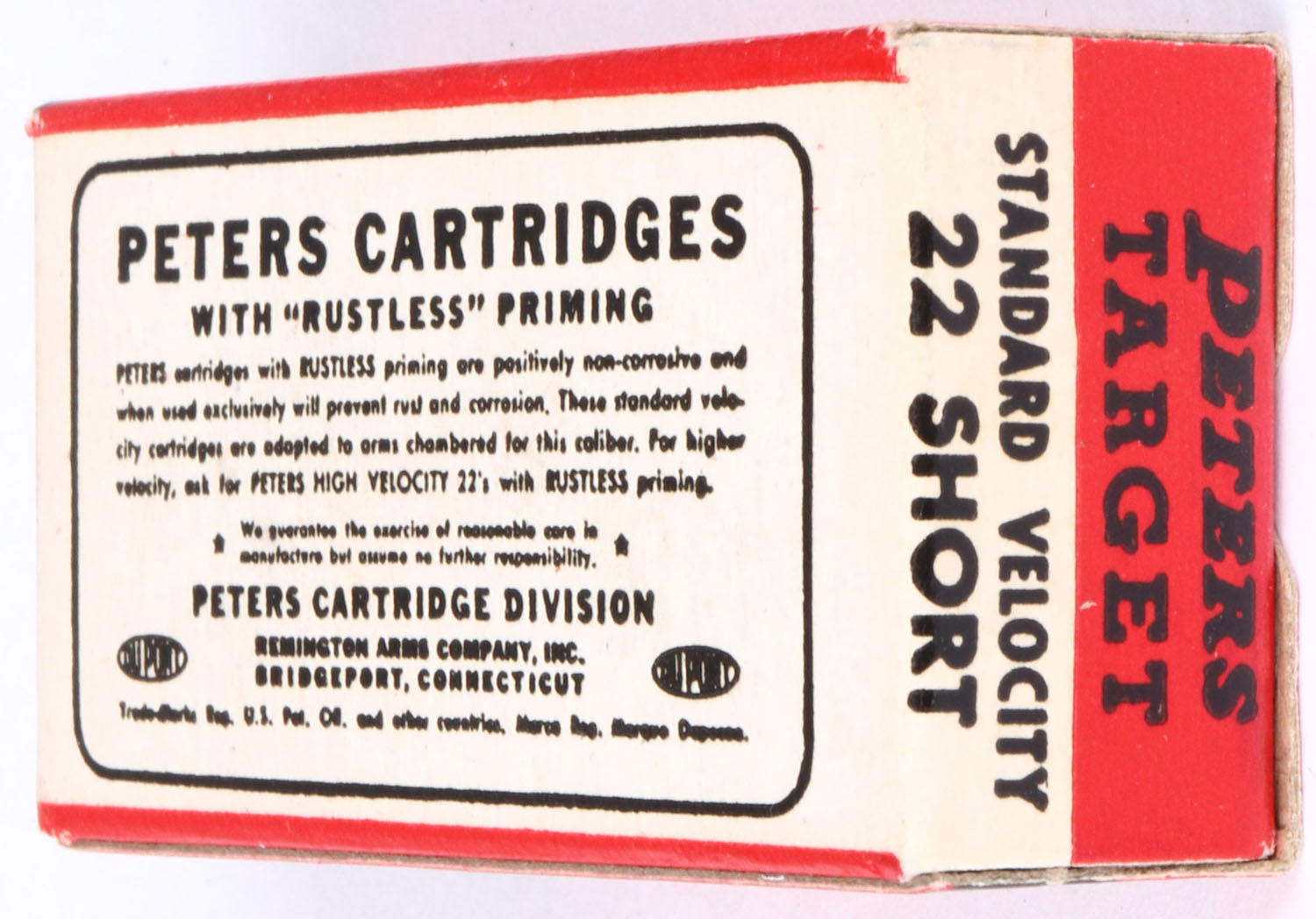 Peters, Target, .22 Short, Standard Velocity, RHWeb: PCC-54C S-2a, Full, 1pc. Red black & white box, box is near mint with excellent to minty color, only very minor age soiling on bottom, corners are sharp, edges are crisp, end flaps are solid, ammo is excellent to minty. Grade: Excellent ++ - Value: 20 to 60