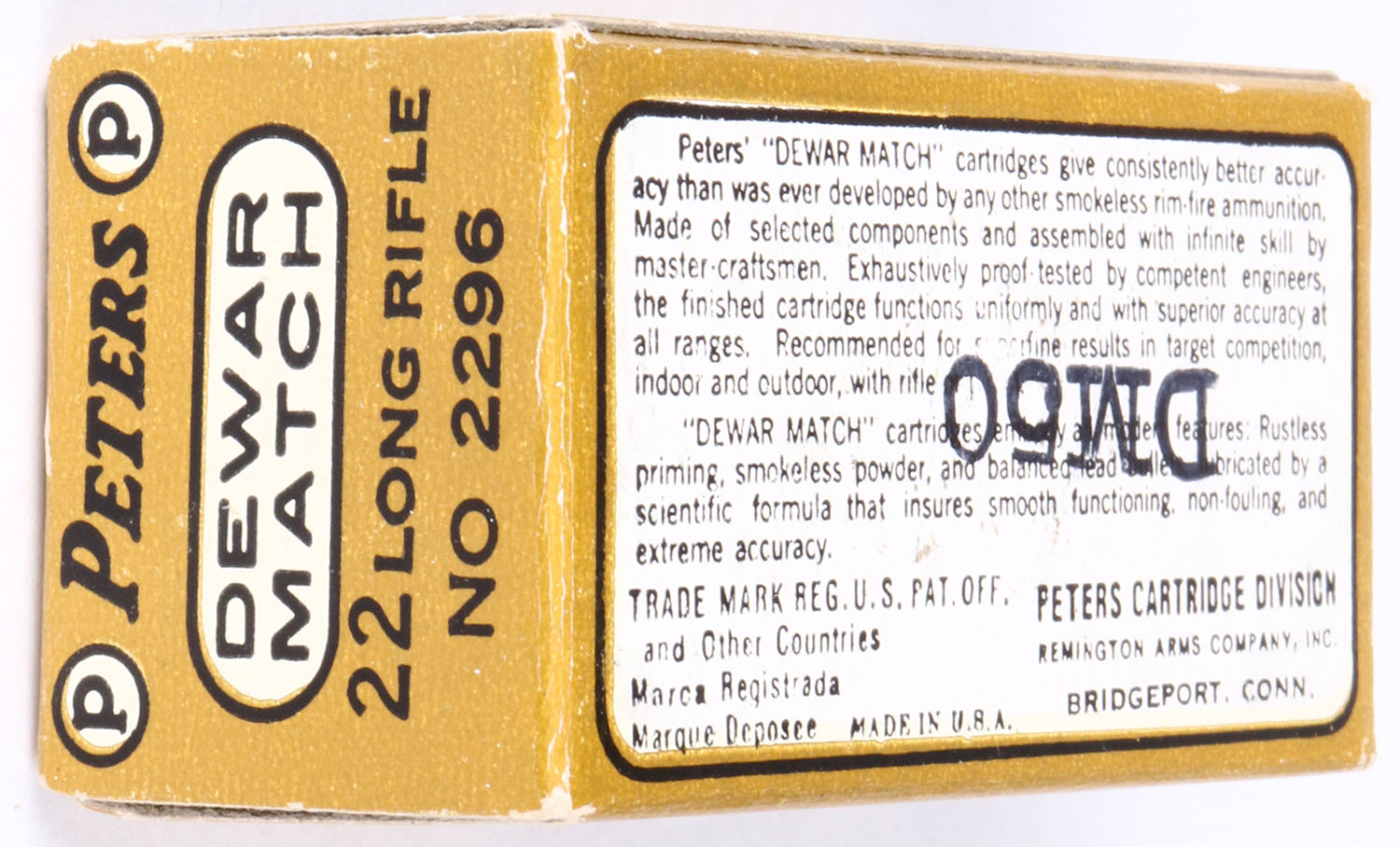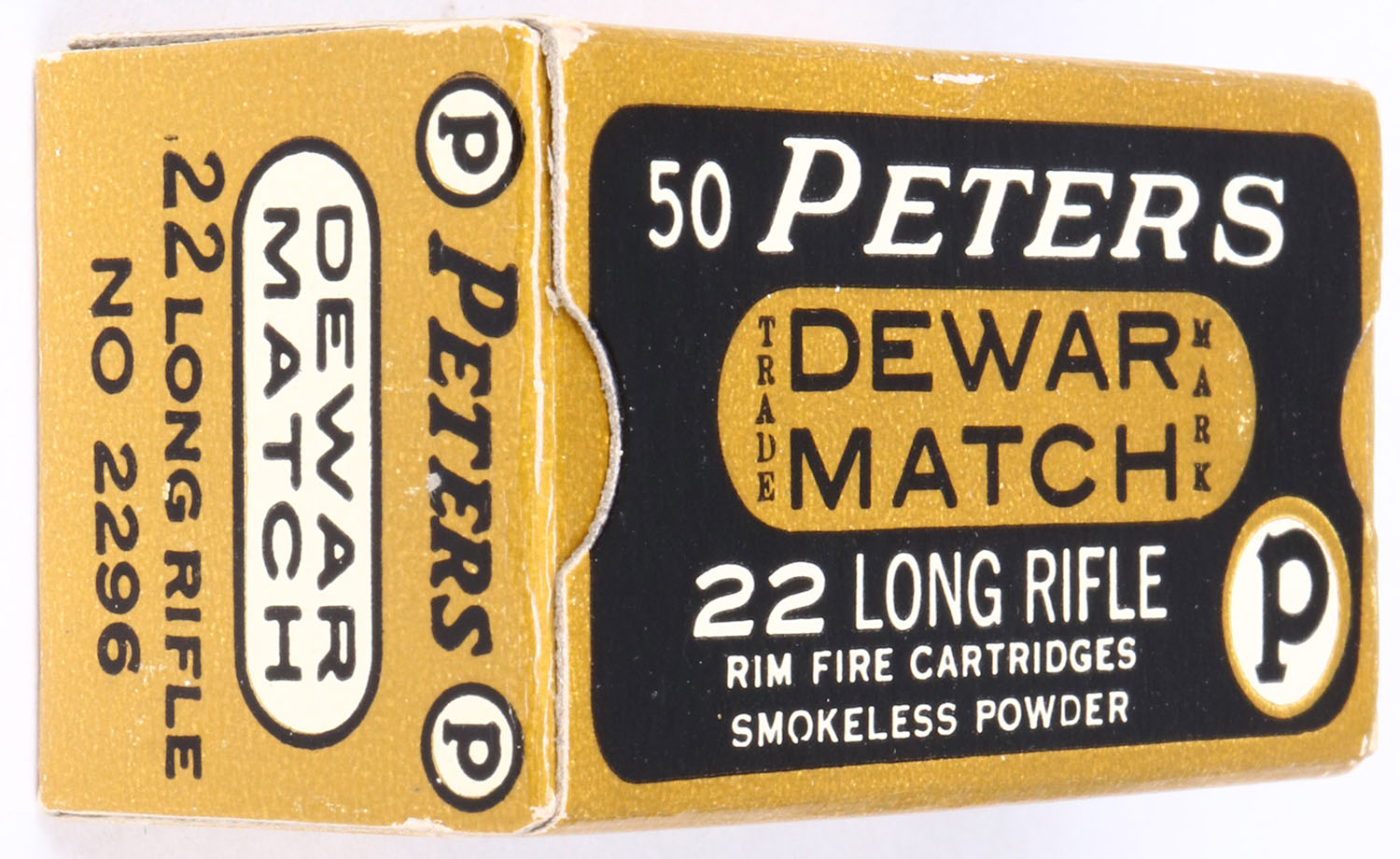 Peters, Dewar Match, .22 Long Rifle, RHWeb: PCC-53B LR-2c, Full, 1pc. Black & gold box, box is solid with minty color, very minor corner wear, edges are crisp, end flaps are solid, ammo is excellent. Grade: Excellent ++ - Value: 10 to 50