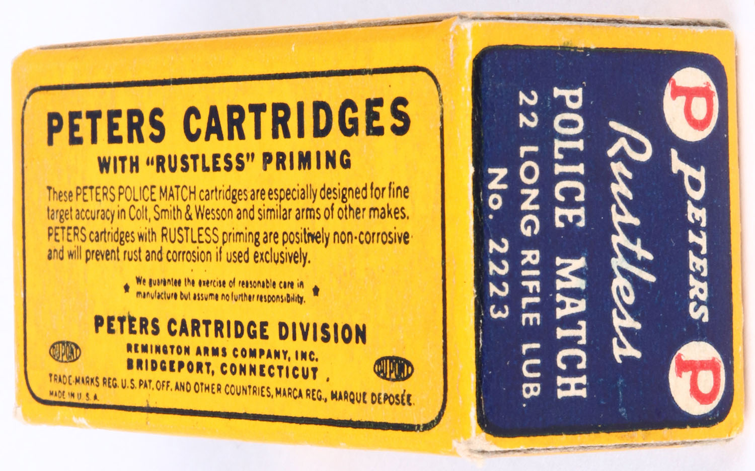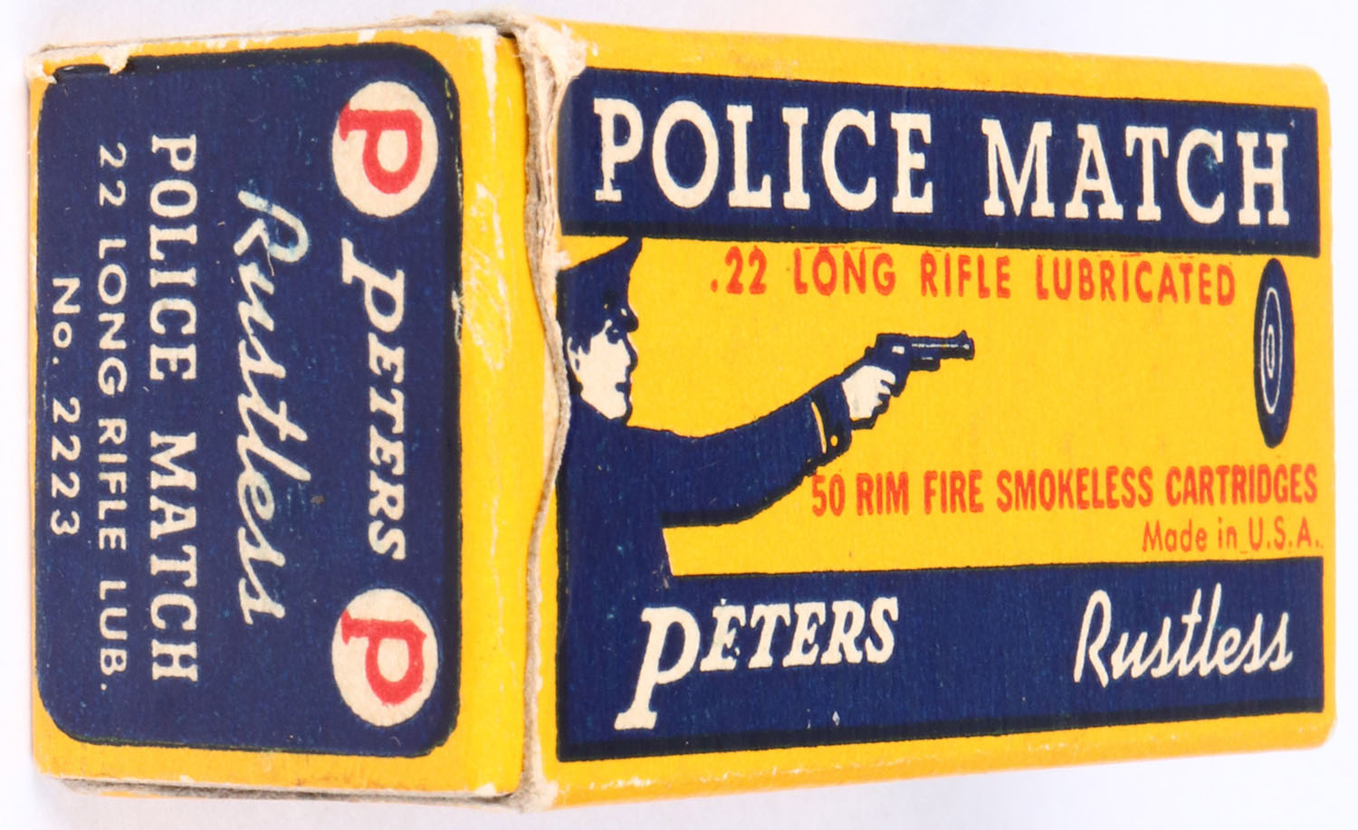 Peters, Police Match, .22 Long Rifle, RHWeb: PCC-53C LR-1b, Full, 1pc. Yellow blue & red box, box is near mint with minty color, only very minor corner wear, edges are crisp, end flaps are solid, ammo is excellent. Grade: Excellent ++ - Value: 50 to 150