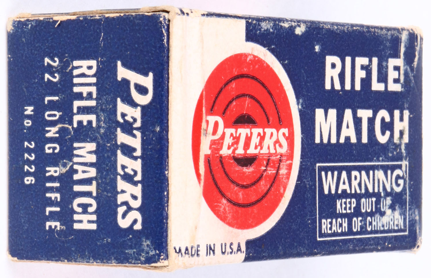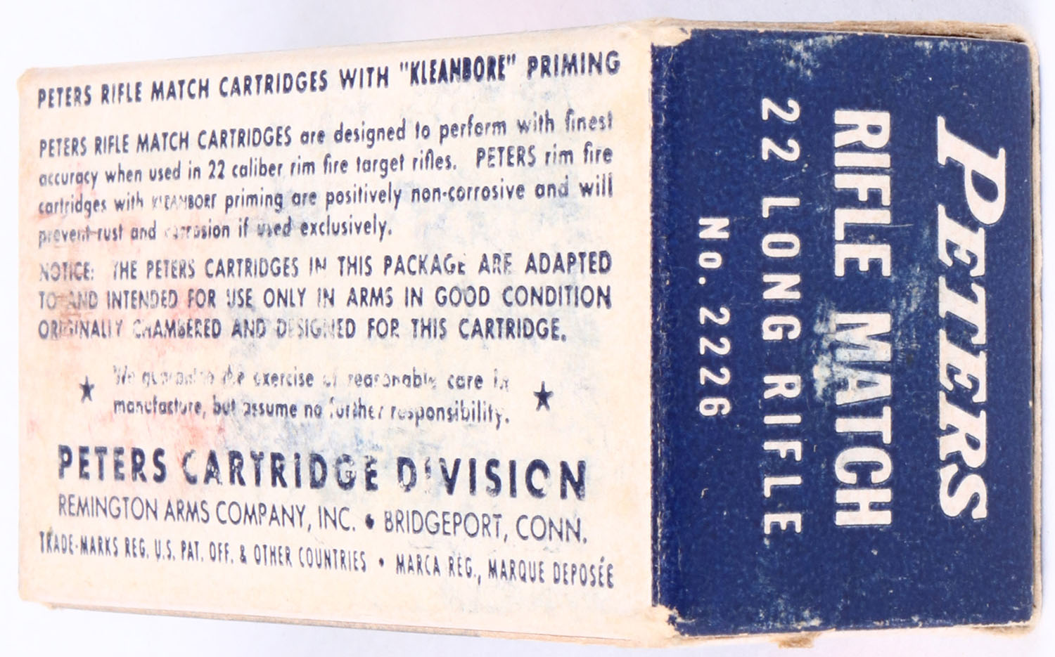 Peters, Rifle Match, .22 Long Rifle, For Use in Rifles Only, RHWeb: PCC-55 LR-6b, Full, 1pc. Blue white & red box, box is solid with excellent color, shelf wear, some edge & corner wear, end flaps are solid, ammo is excellent. Grade: Excellent - Value: 10 to 50