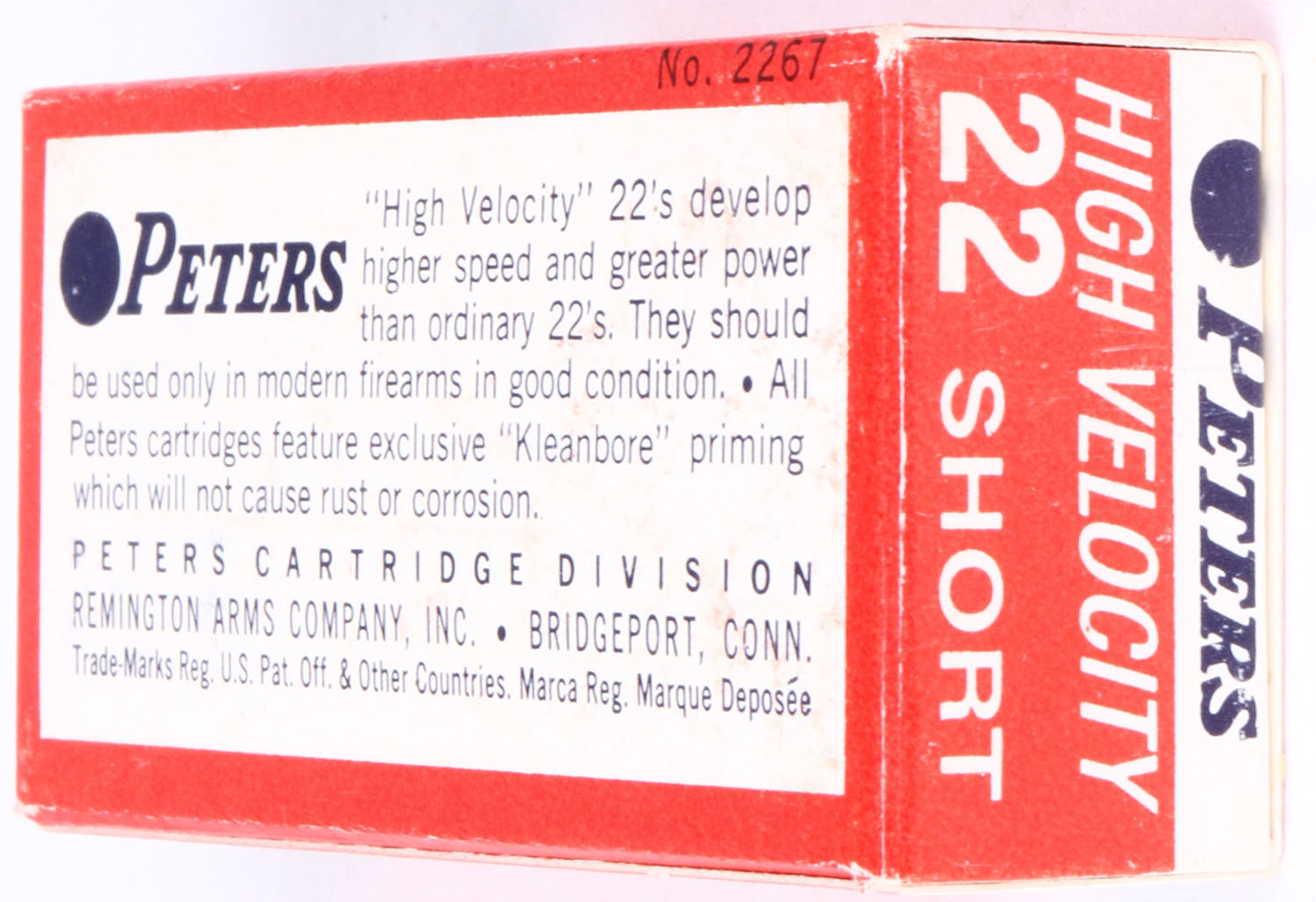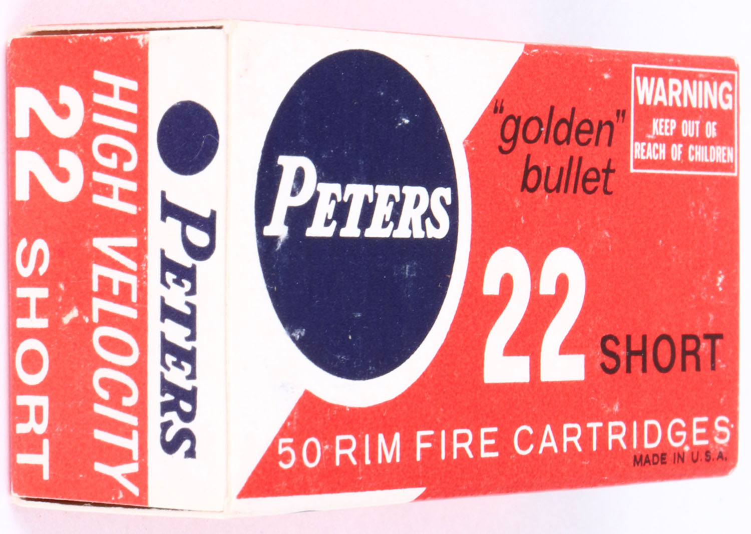 Peters, ''golden'' bullet, .22 Short, High Velocity, RHWeb: PCC-20 S-2b, Full, 1pc. Red white & blue box, box is solid with excellent to minty color, only very minor shelf wear, corners are sharp, edges are crisp, end flaps are solid, ammo is excellent. Grade: Excellent ++ - Value: 8 to 40