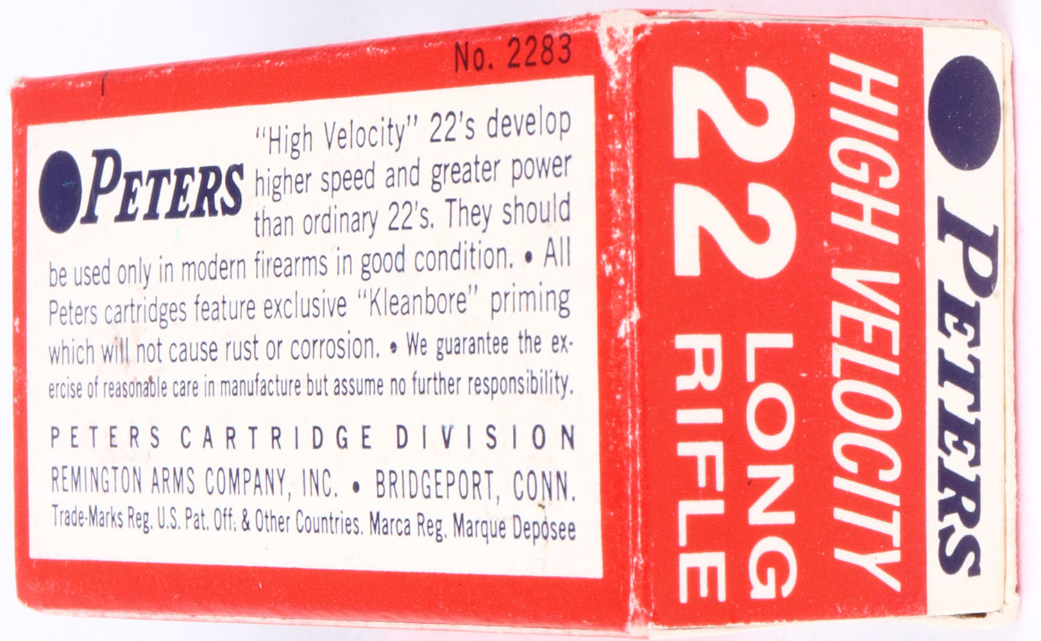 Peters, ''golden'' bullet, .22 Long Rifle, High Velocity, RHWeb: PCC-20 LR-1a, Full, 1pc. Red white & blue box, box is solid with excellent to minty color, very minor corner wear, edges are mostly crisp, end flaps are solid, ammo is excellent. Grade: Excellent ++ - Value: 10 to 50